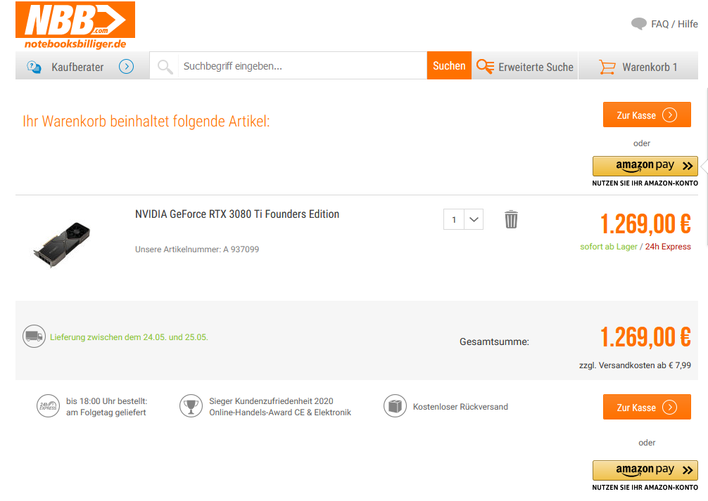 BTW aktuell - Zeitpunkt JETZT - kann man eine RTX 3080 Ti bei NBB für 1269€ ergattern!!!