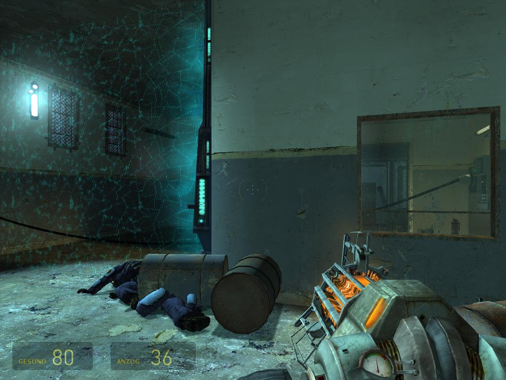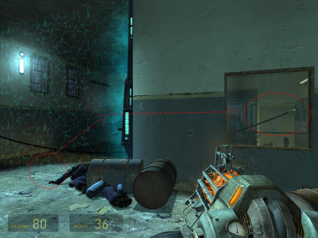 Tipp: Fässer und Heizungen lassen sich auch durch die Absperrungen mit der Gravity-Gun aufnehmen und gegen die Wand schleudern... manchmal trifft man dabei auch was an der Wand...