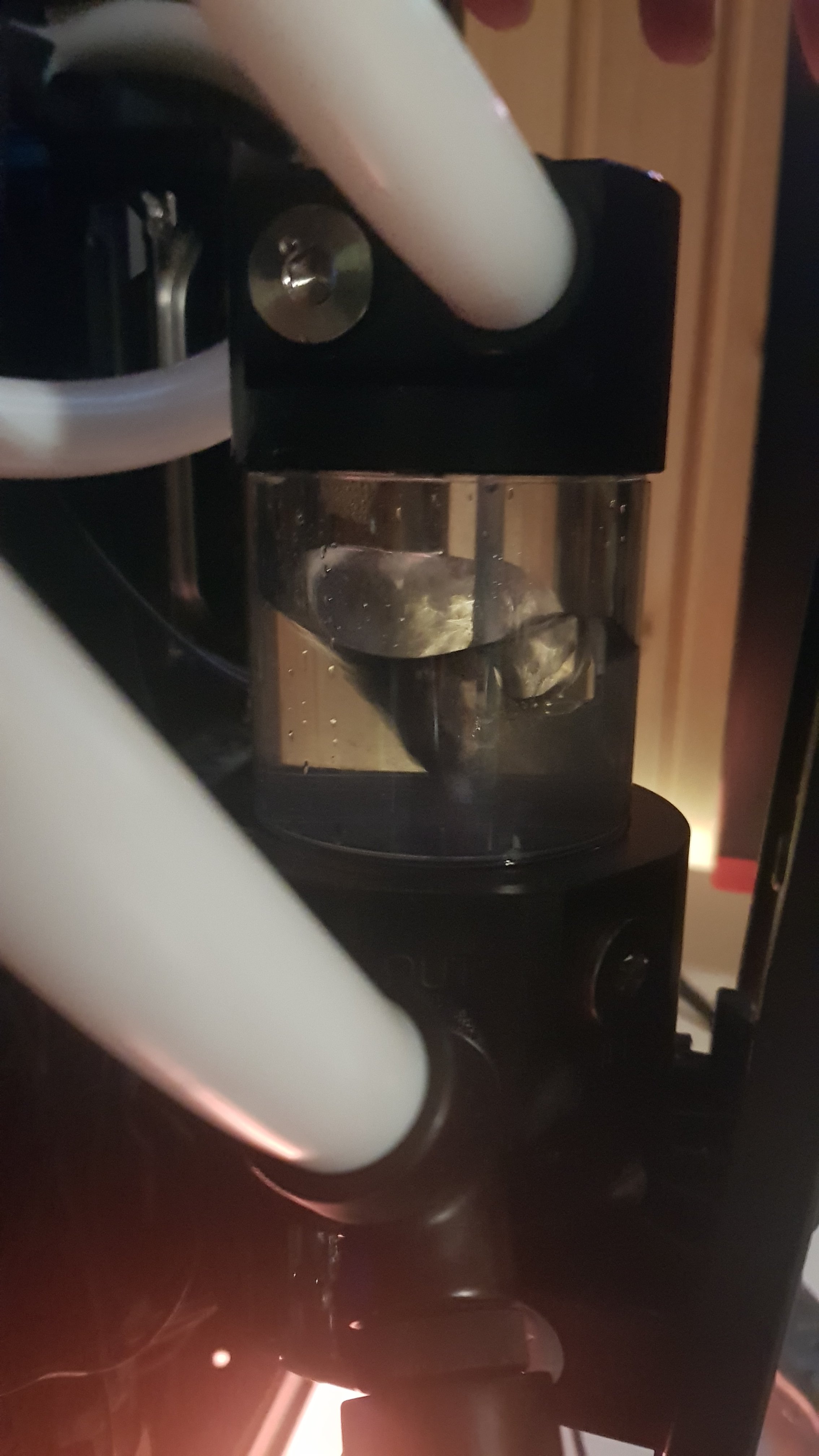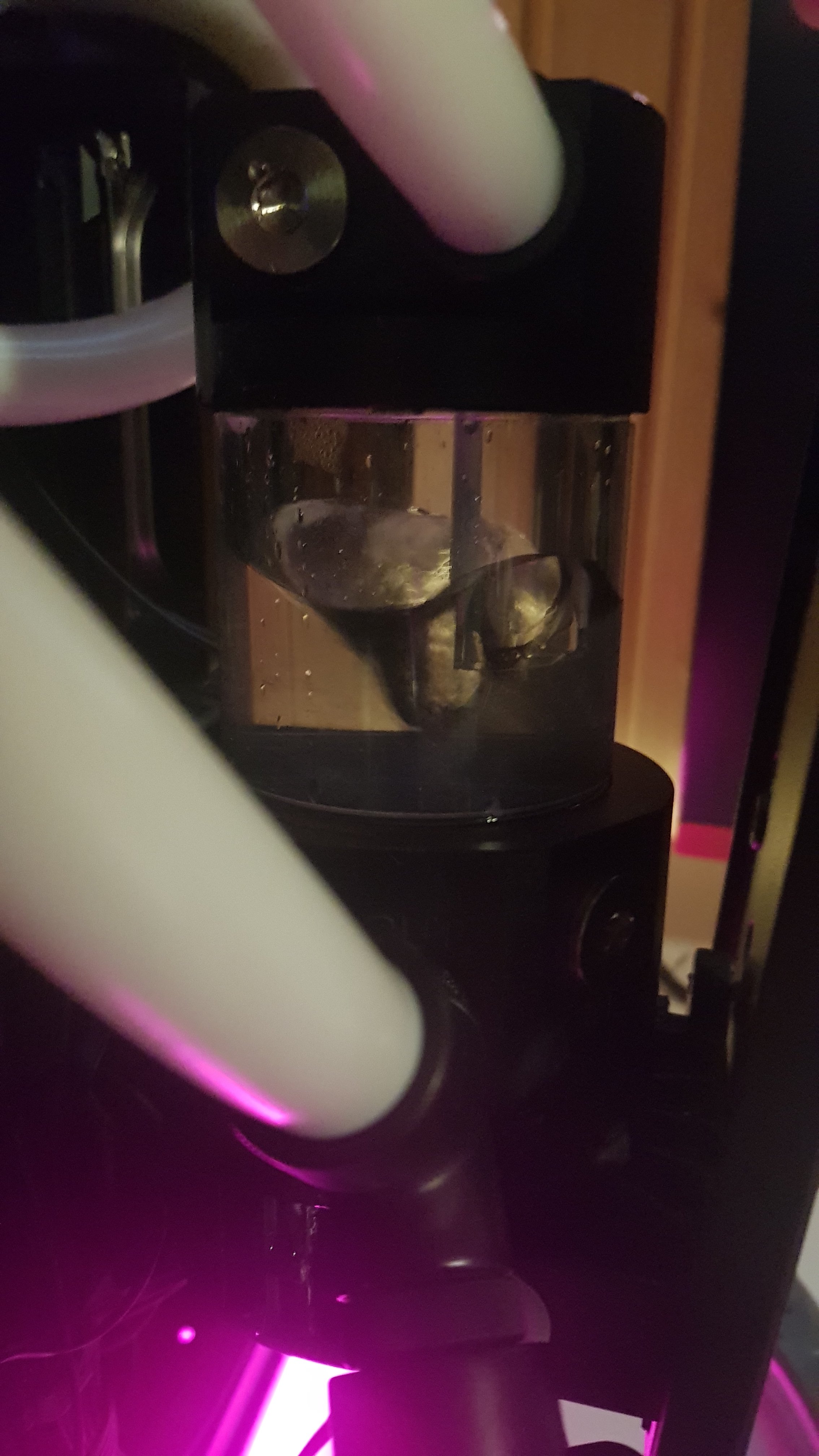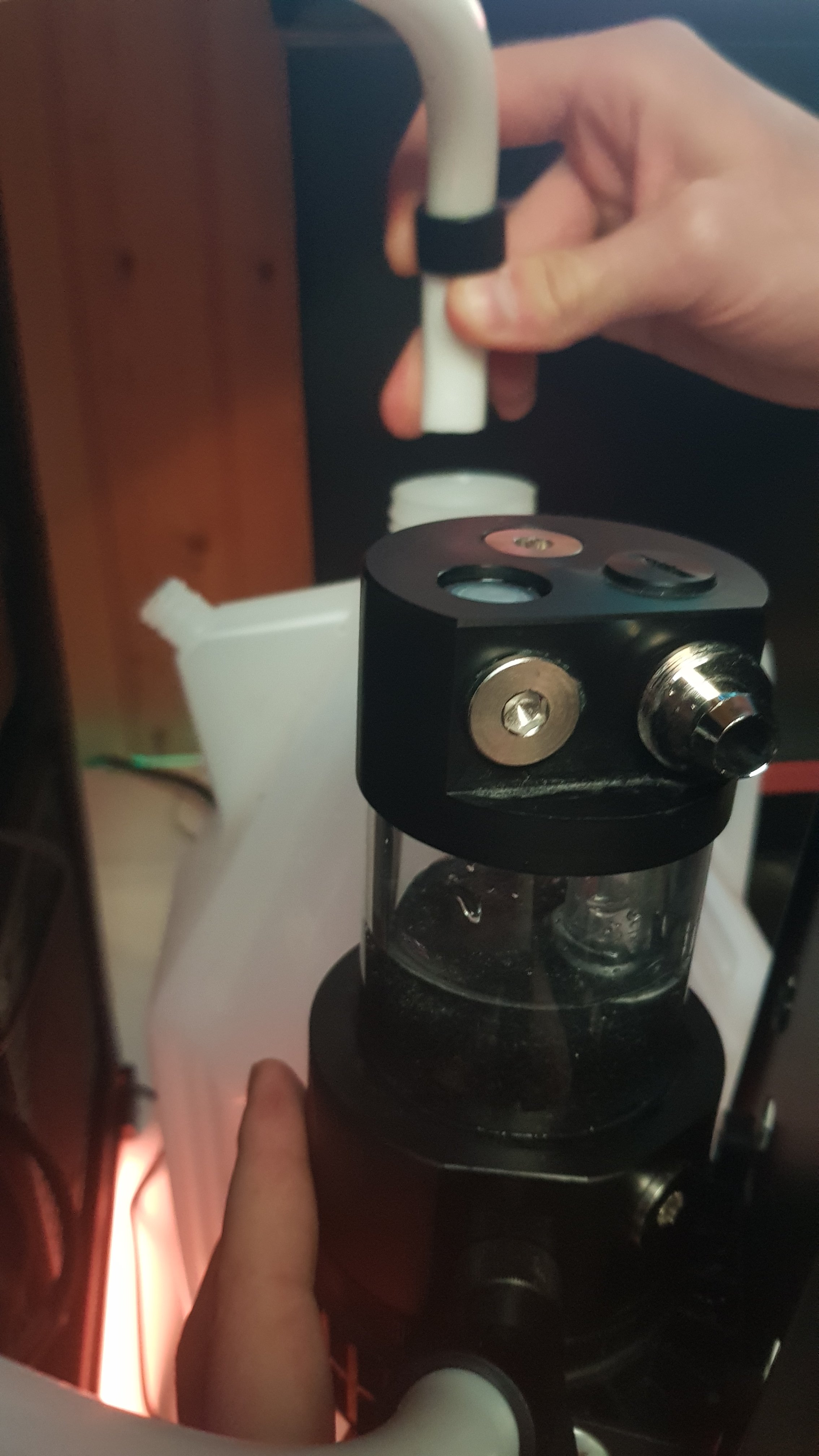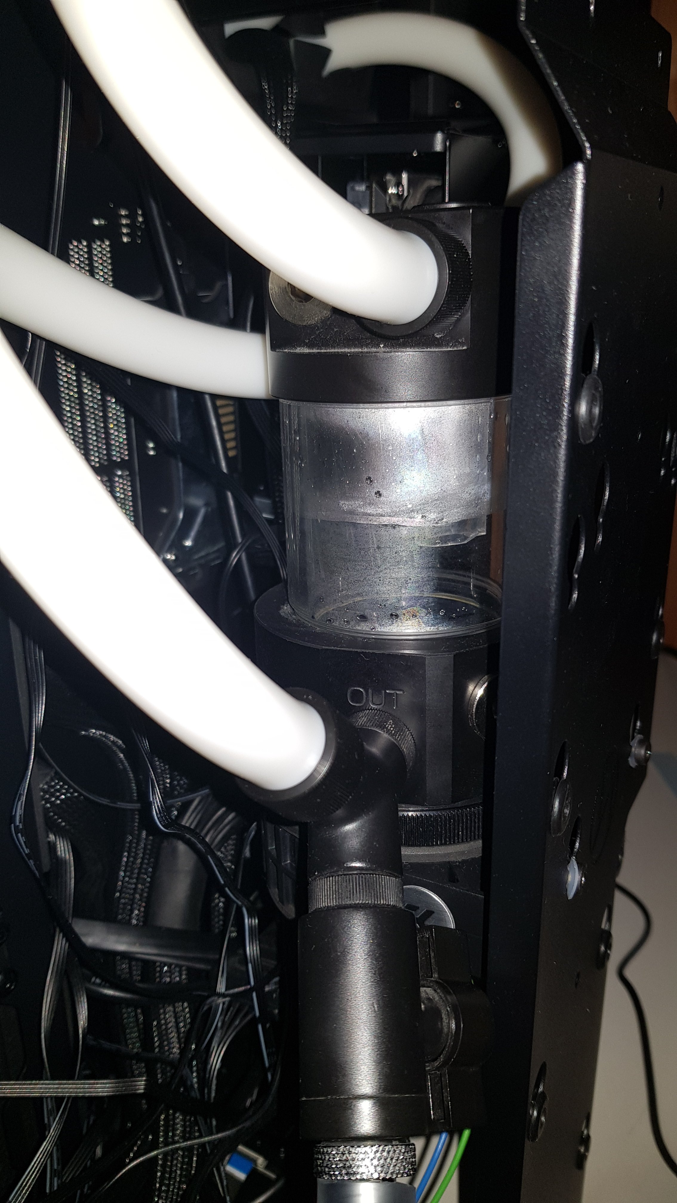 Nun haben wir leider das Problem das die CPU beireits beim hochfahren eine Temperatur zwischen 50 und 60 Grad hat. Desweiteren macht es den anschein als würde die Pumpe nicht pumpen. Am CPU Block und in der Grafikkarte sind noch massig Luftblasen und man kann keine bewegung vom wasser erkennen.