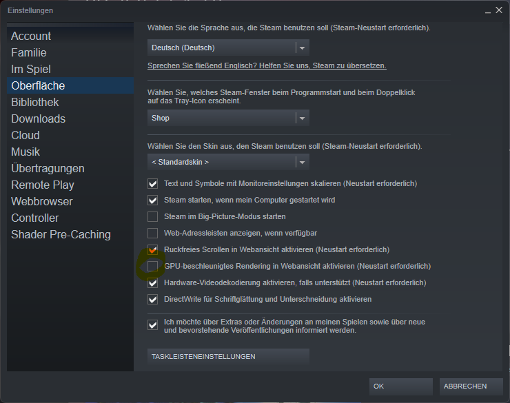 Treiber neu installiert, älteren Treiber neu installiert, Steam-Installation auf eine andere SSD, Monitor Bildschirmwiederholrate 60 Hz anstatt 144 Hz, Windows 10 anstatt Windows 11 danach wieder zurück zu Windows 11 (neu aufgesetzt)