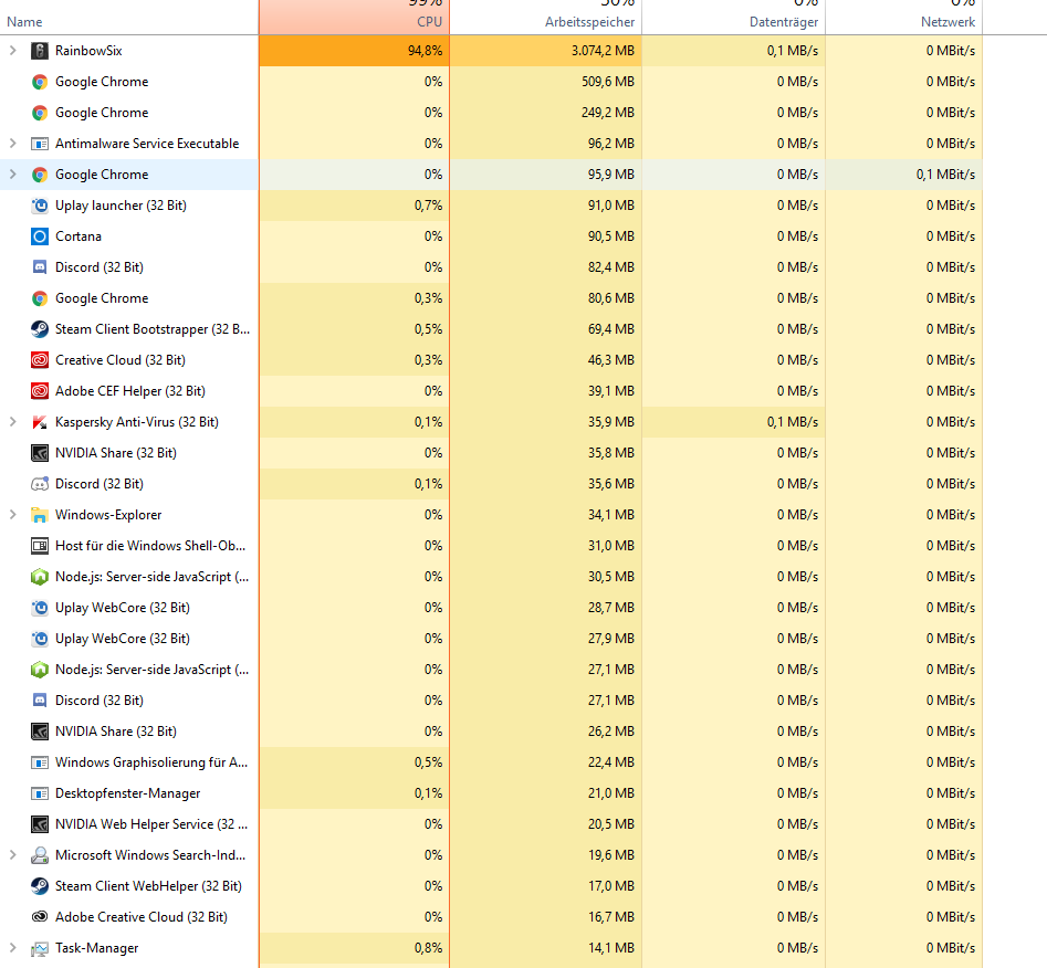 hoffentlich kann mir hier jemand weiterhelfen. Momentan habe ich mit meiner CPU (vermutlich) Probleme. Im normalen Desktop Betrieb ist die Auslastung ganz normal (zwischen 3%-15%). Sobald ich im Spiel (Tom Clancys Rainbow Six Siege) bin, geht die Auslastung ziemlich in die Höhe. Im Spielemenü ist die Auslastung dann schon bei ca. 50%-60%, und sobald ich anfange zu spielen, geht die Auslastung direkt auf 100%. Dann treten auch immer wieder kurze Ruckler auf. Die Grafikeinstellung spielt keine Rolle, sowohl auf niedrig, als auch auf hoch bleibt die Auslastung bei 100%. Ich habe schon das BIOs und alle Treiber aktualisiert, leider ohne Erfolg. Auch das zurücksetzen des Rechners hat leider nicht geholfen. Insgesamt läuft der Rechner wie gewohnt flott und macht keine Probleme. Meine verbaute Hardware ist jetzt ca. ein halbes Jahr alt, und wurde damals auch neu gekauft.