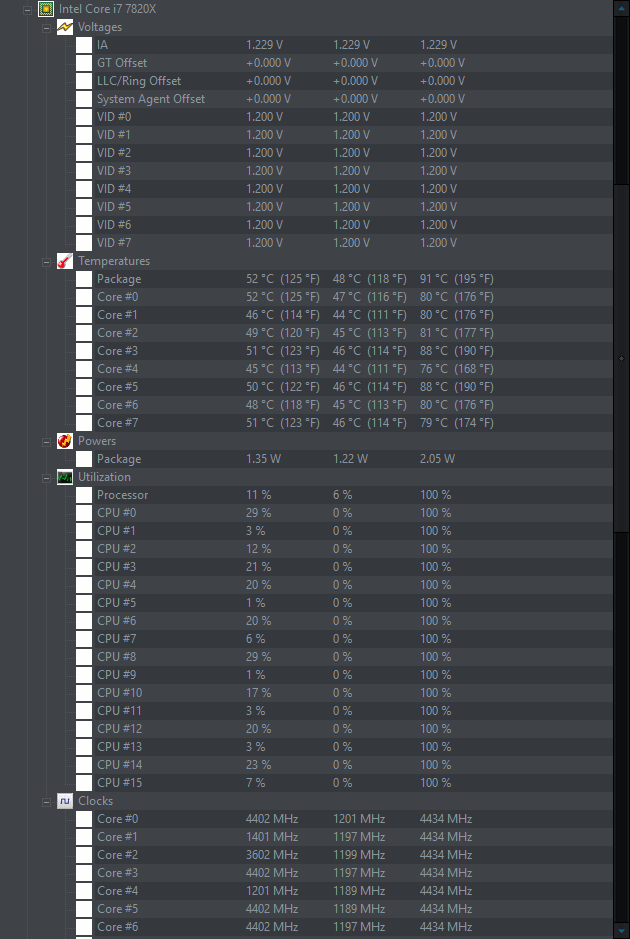 Ich hab neulich mal wegen was anderem mein HWMonitor geöffnet und gesehen dass mein i7 7820x gute 60-70° im Idle schiebt.