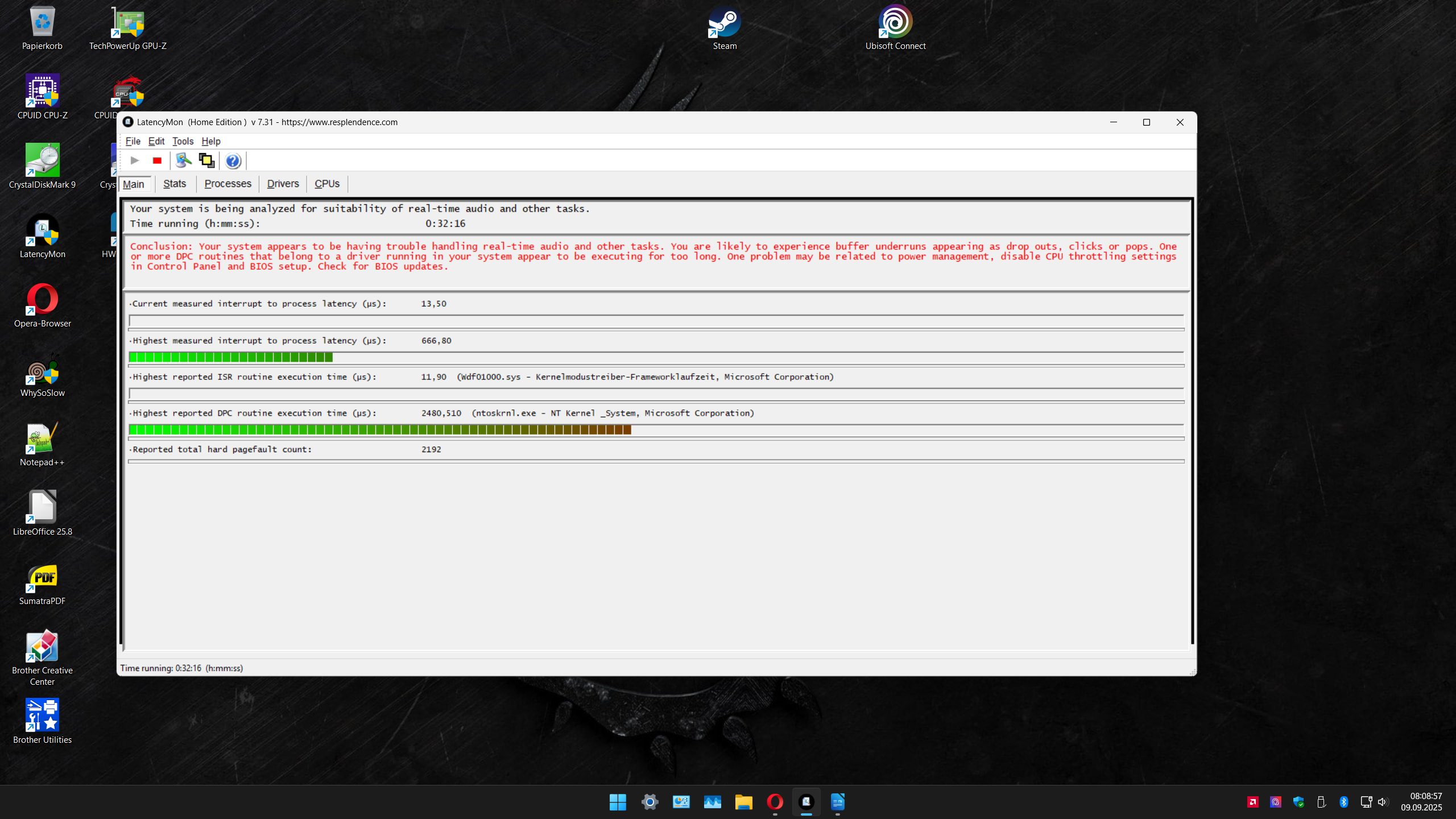 Diese Teile habe in LatencyMon hohe Zeiten, nicht immer alle zur gleichen Zeit. Das resultiert in knacken und knistern in den Soundausgaben und Einbrüche bei den Spielen. In verschiedenen Spielen habe ich 5 bis 30 Minuten spielen können dann sind die FPS aus 3 bis 10 FPS eingebrochen, also unspielbar. Das ist passiert bei Spielen die ich über STEAM oder Ubisoft Connect gestartet habe.