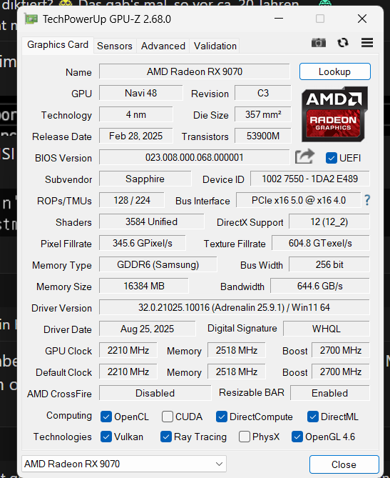 Graphics: Sapphire Nitro+ Radeon RX 9070, 16GB GDDR6