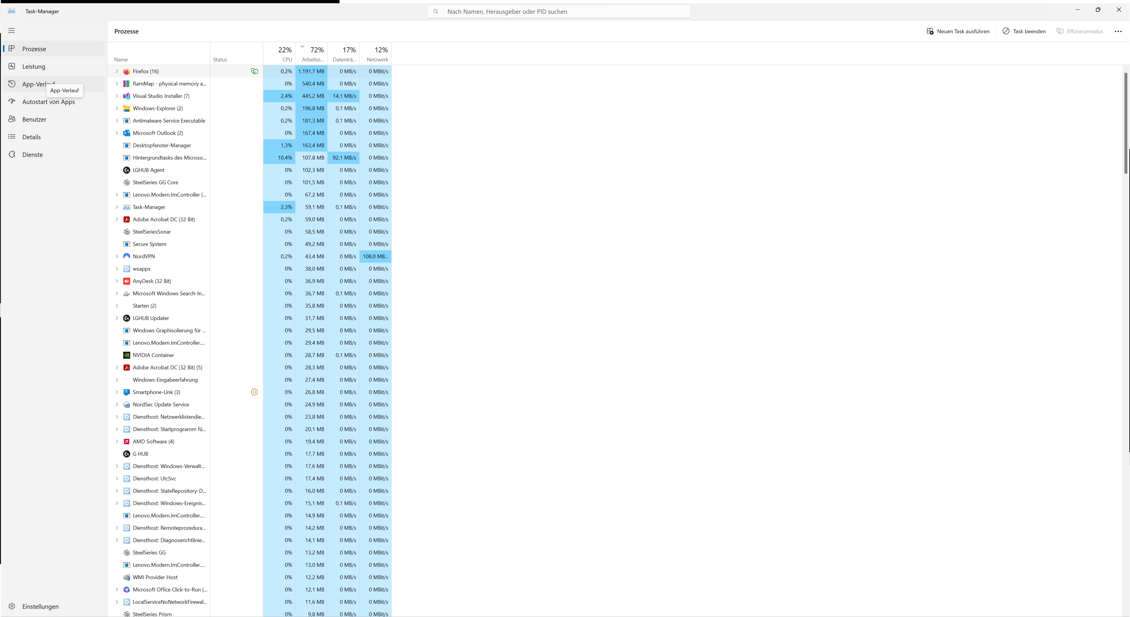 Die Ram Auslastung ist nie unter 50%. Selbst wenn ich runterfahre, warte, neustarte und 10 min abwarte sodass Windows mit allem durch sein sollte zeigt der Taskmanager ohne auch nur ein einziges Programm angefasst zu haben mindestens 50%. Firefox nimmt sich dann direkt 1-2 gb für das existierten und mit explorer und einigen Anwendungen zum arbetien bin ich sofort bei 80%. Regelmäßig stoße ich an die 100 und es wird anstrengend. Standardauslastung sind ca 80% beim surfen. 90-100 beim arbeiten.