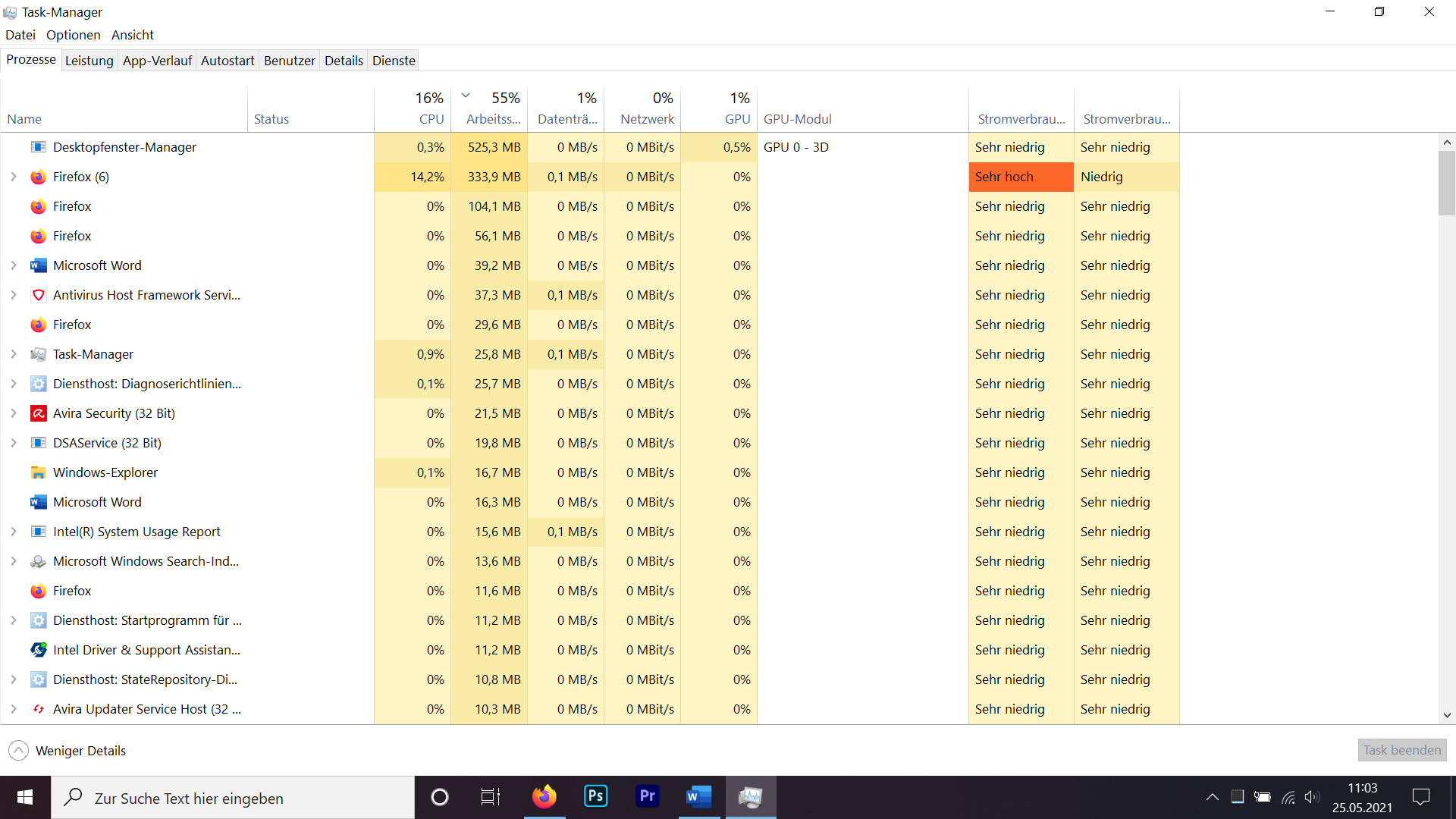 Im Screenshot sieht man auch die Auslastung. Das kuriose ist, dass nach dem Systemstart der Desktopfenstermanager nur ca. 50-70 MB vom RAM benötigt. Nach ca. 10 Minuten Betriebszeit vom Notebook, geht es aber hoch in Richtung 500 MB. Ich habe lediglich Firefox und MS Office geöffnet. Hat jemand eine Idee, was die Ursache sein kann? Ich weiß sonst leider nicht mehr, was ich machen kann... der Lüfter ist sonst ziemlich oft an und das Notebook wird heißer als es ursprünglich war...