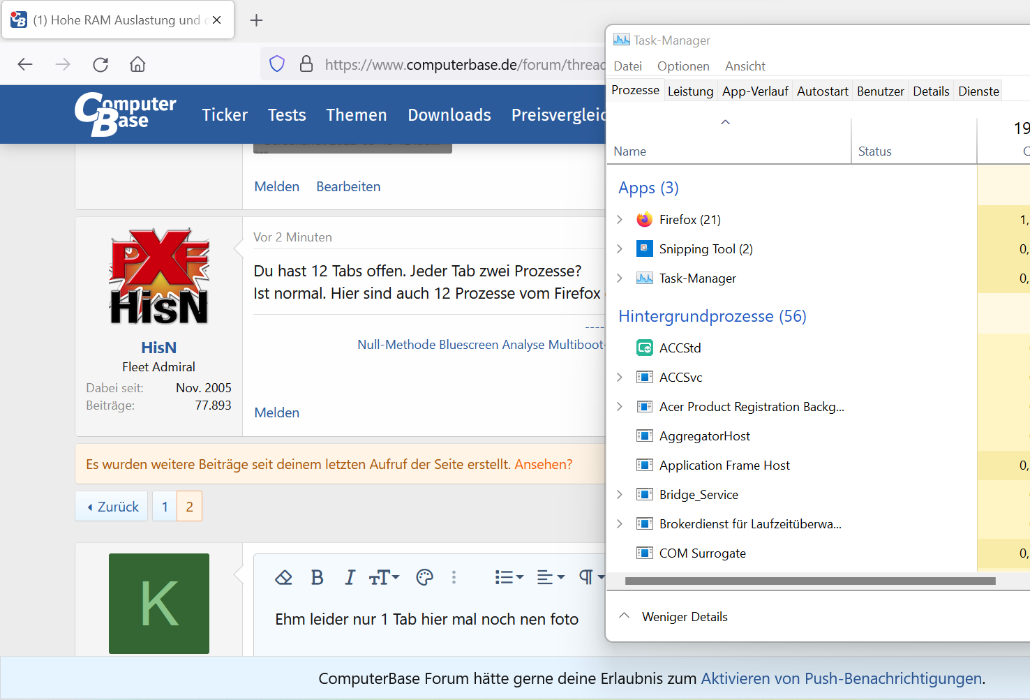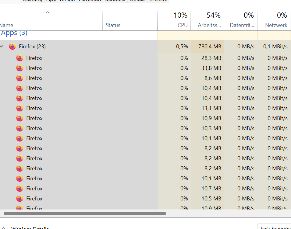 ich stimme euch zu es kann nicht das Problem sein aber ich meine das Problem entdeckt zu haben, anbei mal ein Foto von meinem Taskmanager wenn ich nur Firefox starte öffnet er komischerweise gleich 23 Prozesse.
