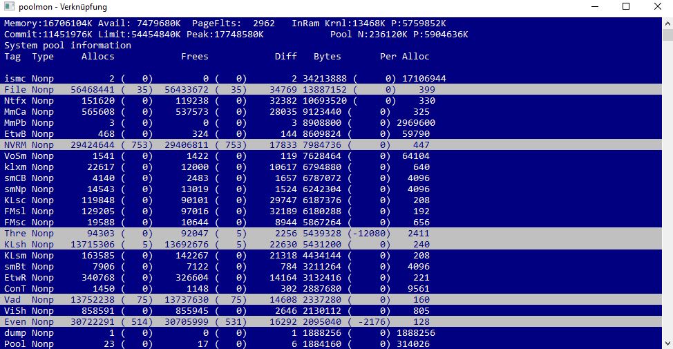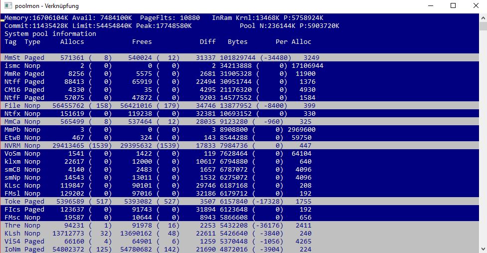 Hier einmal der Obere Abschnit von Poolmon Grundsätzlich mit B nach Bytes Sortiert und dann jeweils einmal Type unsortiert, nach NonPaged und nach Paged Sortiert