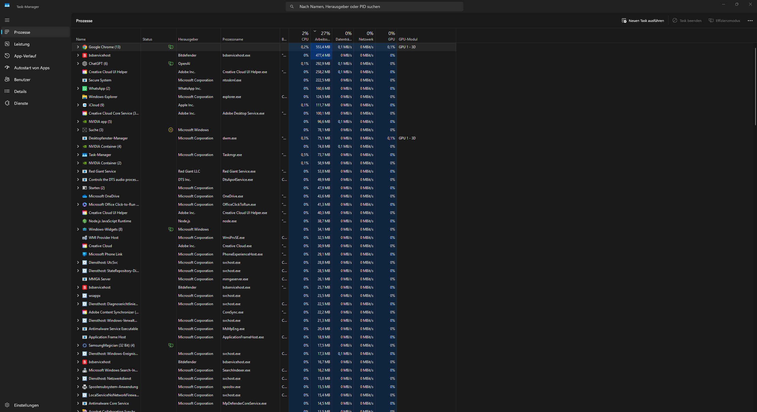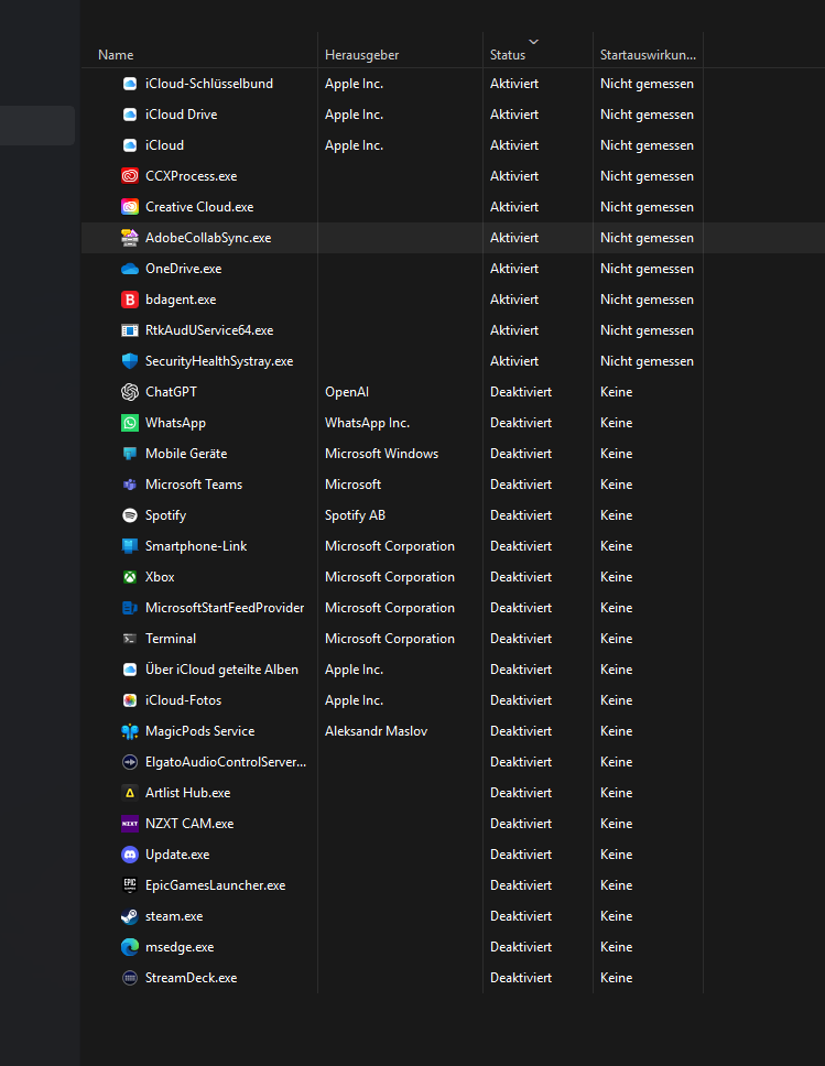 Memtest, Windows speicherdiagnose, sfc, dism health check habe ich alles schon mehrfach durchlaufen lassen, alles ohne Fehler. Im ressourcenmonitor hab ich leider auch nichts hilfreicheres gefunden, außer die Infos aus dem Task manager. Virentests hab ich auch mehrfach mit defender, defender offline scan, bitdefender und dem windows mrt scanner durchgeführt, welche alle nichts gefunden haben. Die Programme, die ich im Autostart aktiviert habe, sollten das eigentlich auch nicht verursachen.
