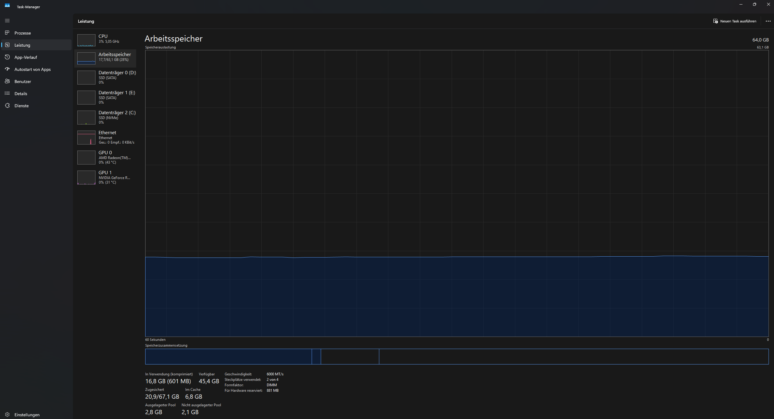 Nun ist es aktuell so, dass beim Ram gerne mal 17gb im Idle belegt ist. Wenn ich unter Prozesse nach Ram Nutzung sortiere, komme ich da ziemlich sicher nicht auf 17gb mit allen Prozessen, die aufgelistet werden.