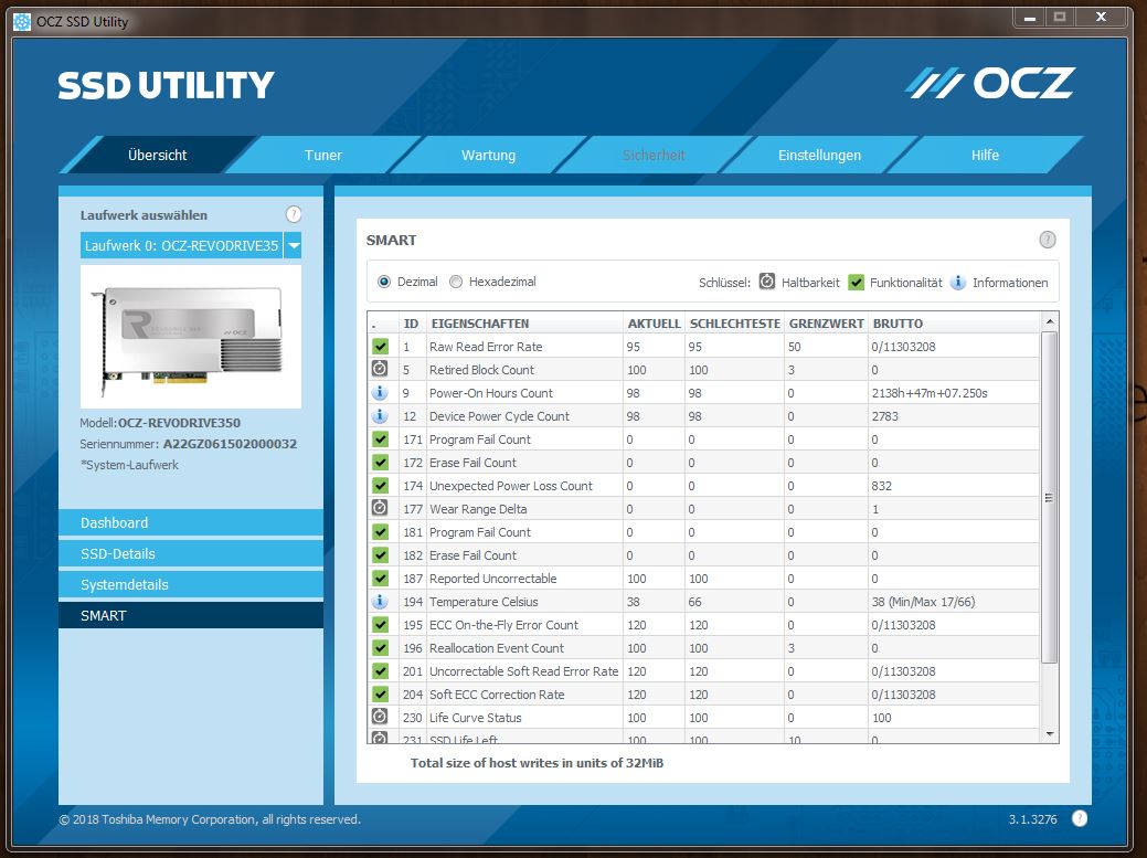 Das Problem der Revos ist, dass es keine nativen PCIe SSDs sind wie sie heute verbreitet sind, sondern ein RAID aus SATA SSD und da liegt es am RAID Controller wie er mit den Anfragen zum Auslesen der S.M.A.R.T. Werte umgeht. Bei den meisten HW-RAID Controllern kann man die S.M.A.R.T. der einzelnen Laufwerke nur über des eigene Tool des Herstellers auslesen, hier scheint es mir ab so zu sein, dass der RAID Controller CDI einfach immer wieder die Werte eines Laufwerks präsentiert und daher Werte plötzlich wieder geringe sind, die eigentlich nur steigen sollten.Chuuei schrieb:Und das CDI hier Mist baut sieht man im Vergleich mit den OCZ Tool, welches man ja hier als Referenz nehmen sollte