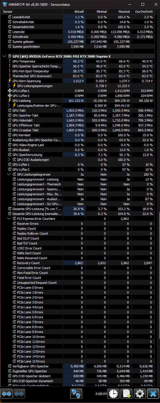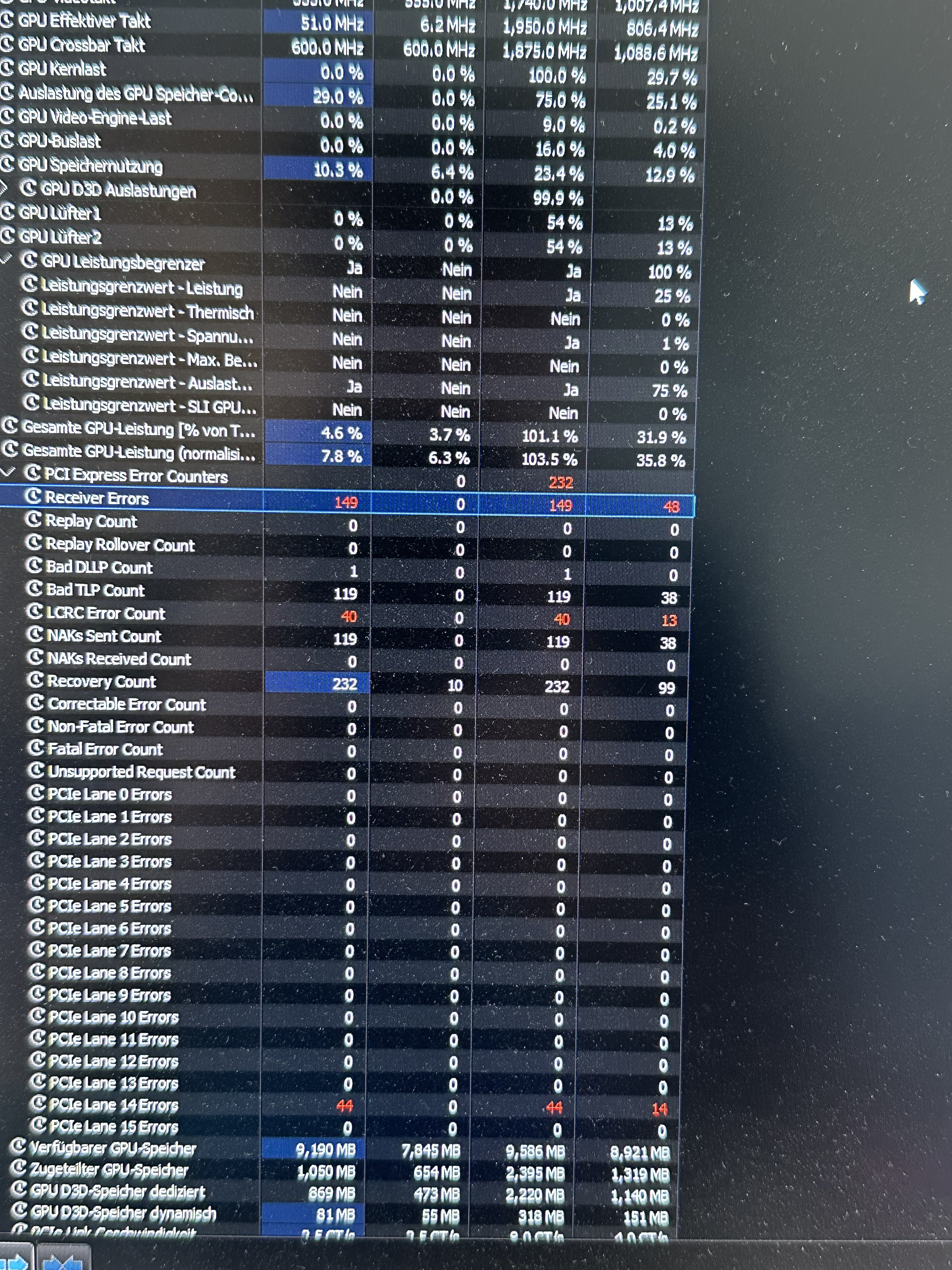 Mir sind in HWINFO sehr hohe Werte im Bereich PCI Express Error Counters aufgefallen. Nachdem ich meinen PC sauber gemacht und alles wieder zusammengebaut hatte, habe ich ihn gestartet und mal in HWInfo geschaut ob die Werte soweit stimmen. Dort ist mir allerdings aufgefallen, dass die Recovery Errors im PCI Bereich nach und nach im Idle ansteigen. Dann startete ich einen 3dmark test für die Grafikkarte und dann sind die Werte der Fehler völlig explodiert. Dies könnt ihr im Screenshot sehen. Nicht auf dem Screenshot zu sehen ist der Wert der Lane 14, die 255 anzeigt. Irgendwas scheint doch dann mit der nicht in Ordnung zu sein oder?