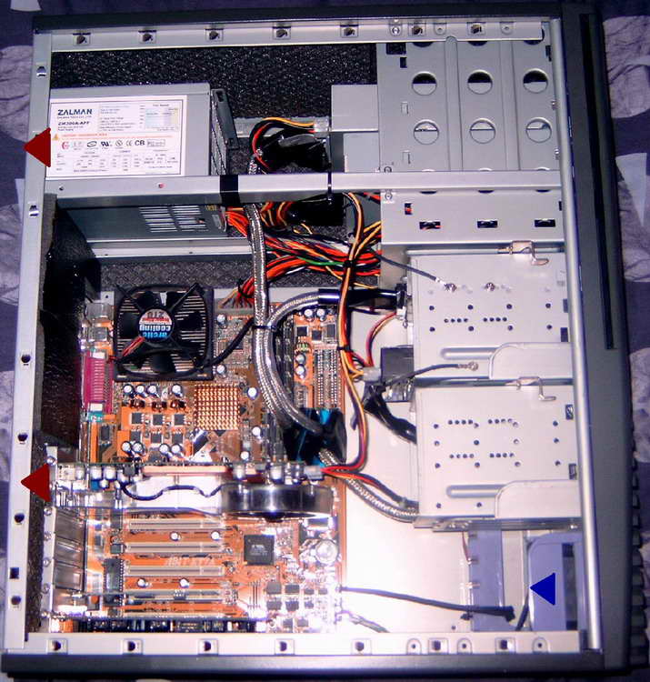 So hier auch mal paar Bilder von meinem PC... P4 3,4C @ 4 Ghz + Geforce 6800GT @ 440/1250 auf nem Abit IC 7 MAX3 mit 1GB Adata DDR 450@472 Sound kommt von ner Audigy 2 ZS und dann noch 560 GB auf 4 Festplatten verteilt,..