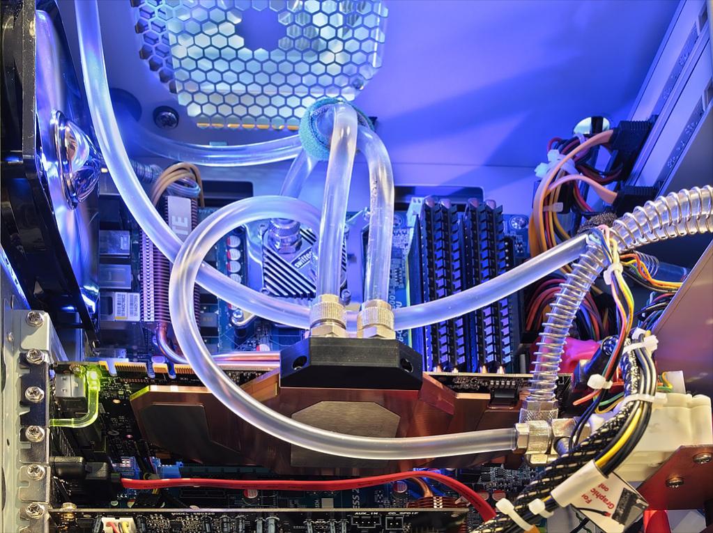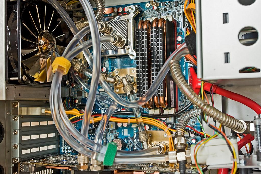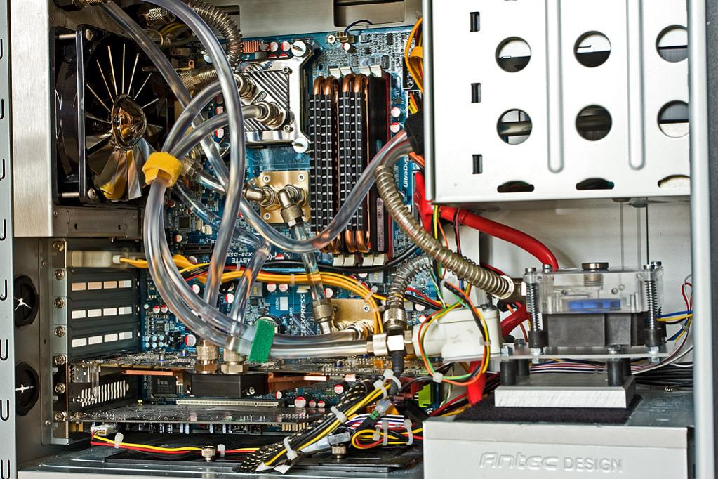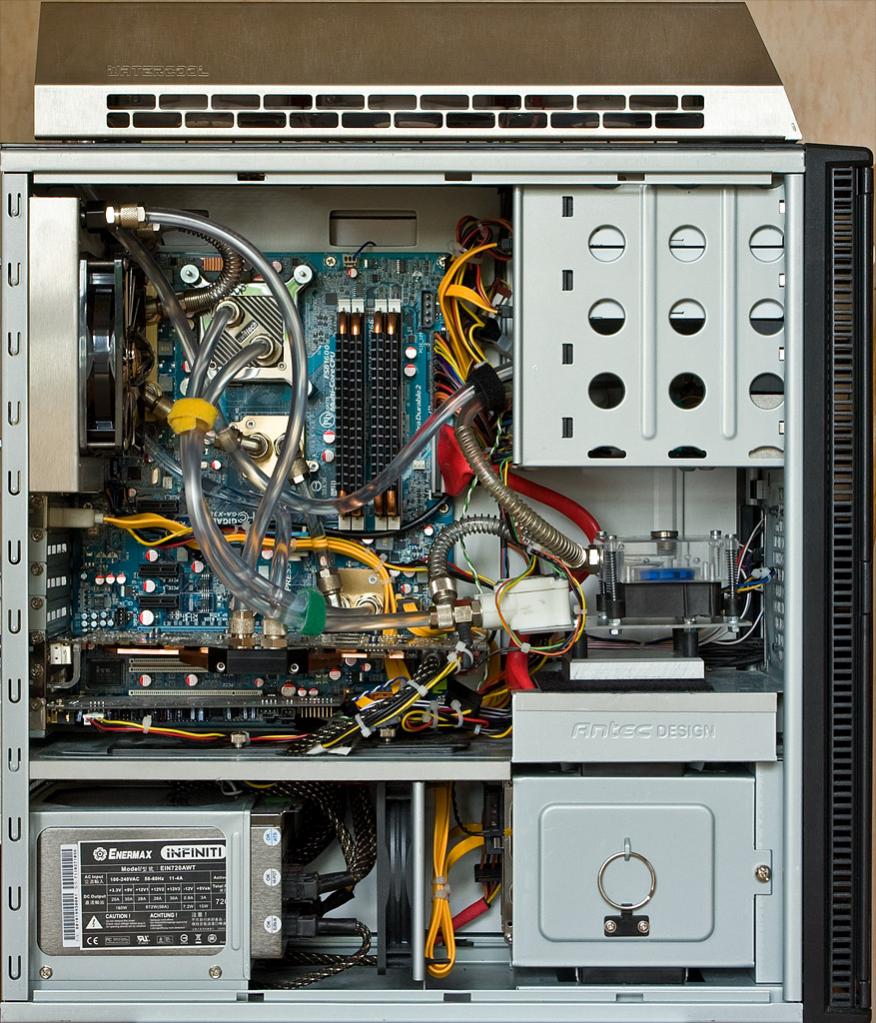 Mainboard mit MIPS Freezern ausgestattet, Laing DDC Pro auf Innovatek Entkopplungssockel gebaut, dafür Adapterplatte aus Plexiglas (Eigenbau) angefertigt. Das Bild von der Grafikkarte ist allerdings kurz vor dem Umbau entstanden.