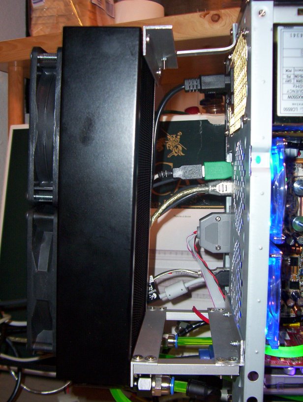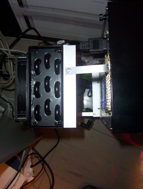 War nicht leicht, den Radi irgendwo unterzubringen. Hab mir ne Halterung gebaut und ihn hinten ans Gehäuse gepackt, da stört er am wenigsten. Ich hoffe das hält, aber es macht nen recht stabilen Eindruck.