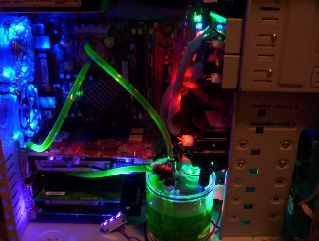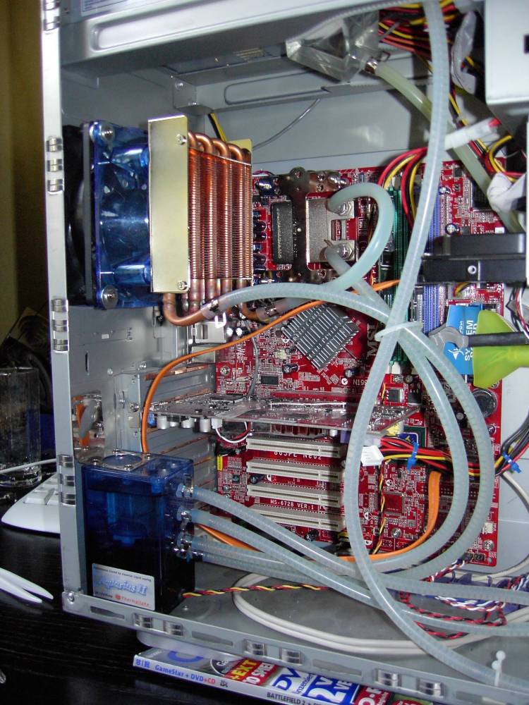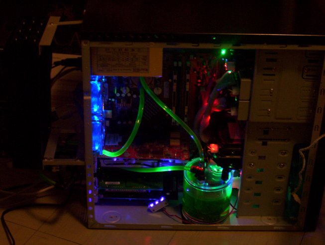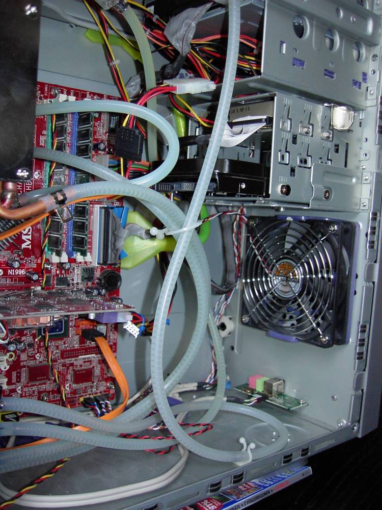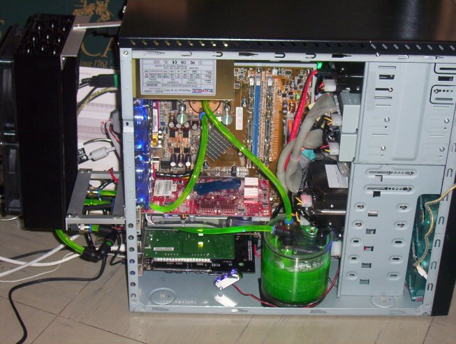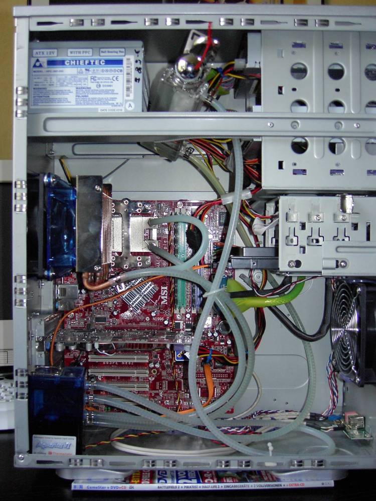 also ich zieh jetzt auch mal nach und setz einfach ma en paar Bilder von meinem "Schatz" rein... die Wakü hab ich erst seit Samstag, war en haufen Arbeit, hat sich aber gelohnt, bis auf das Problem mitm Chipsatz (welches ich in nem anderen thread schon behandelt hab...aber nicht gelöst ^^)... Auffälligkeiten gibts eigentlich keine, hab nur den Lüfter vom nt abgekappt und an die lüftersteuerung gehängt, und seit dem klappert er ab und zu (ein kurzer schlag genügt un er gibts ruhe