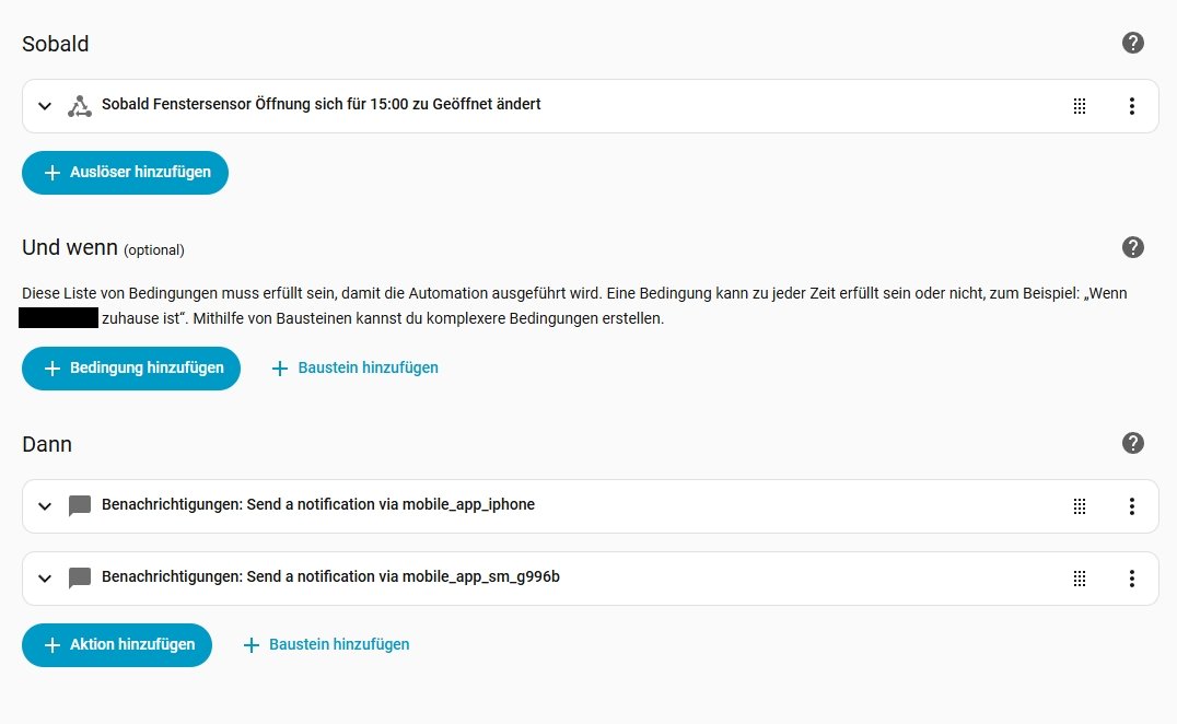 ich habe aktuell eine Regel eingerichtet die bewirkt, dass ich eine Push Benachrichtigung aufs Handy bekomme wenn ein Fenstersensor 15 Minuten lang den Zustand "offen" meldet in Form von "Gästebad Fenster offen". Dazu habe ich eine Entität "Gästebad Fenster geöffnet" eingerichtet die das bewirkt, im Detail: