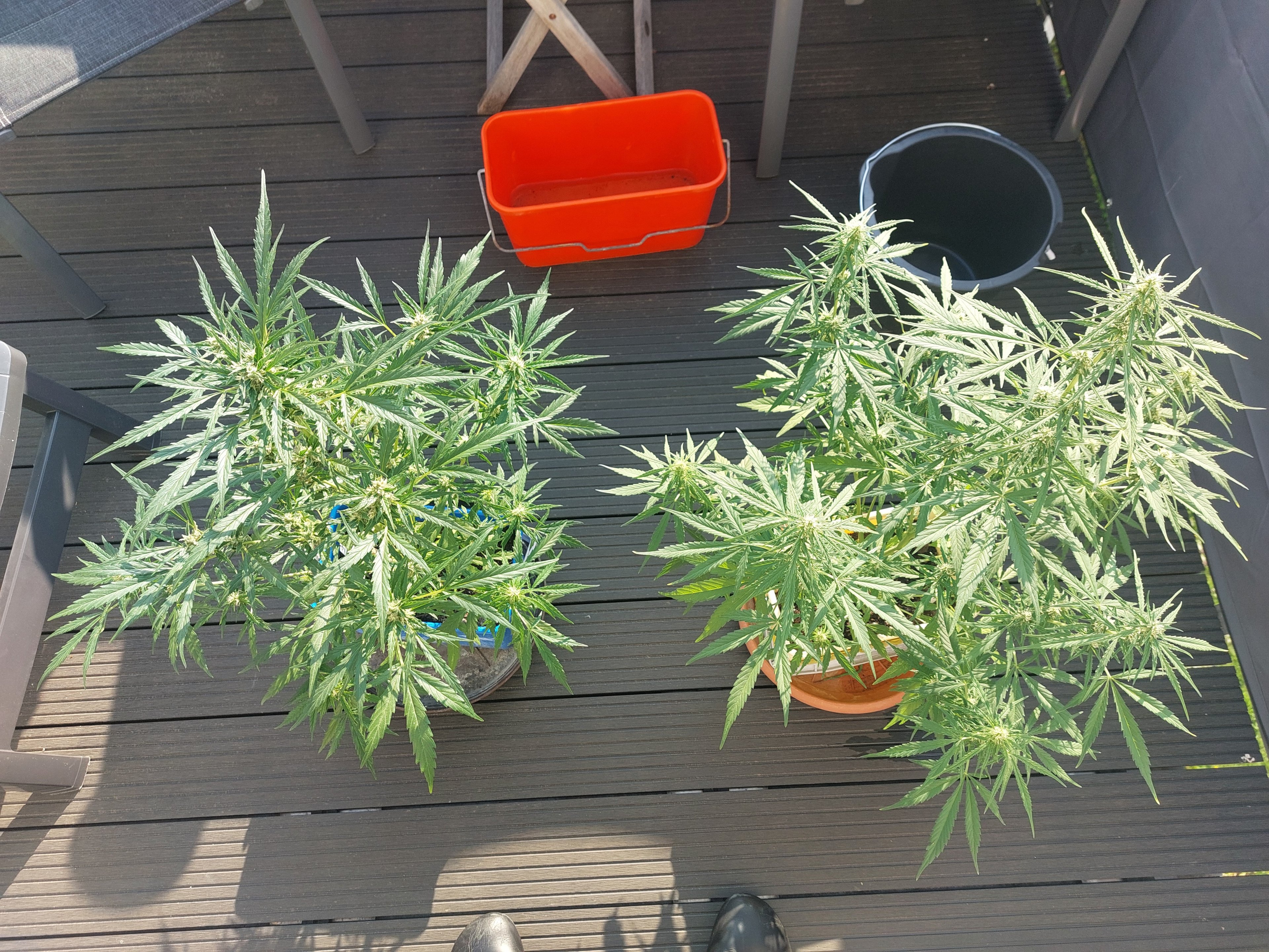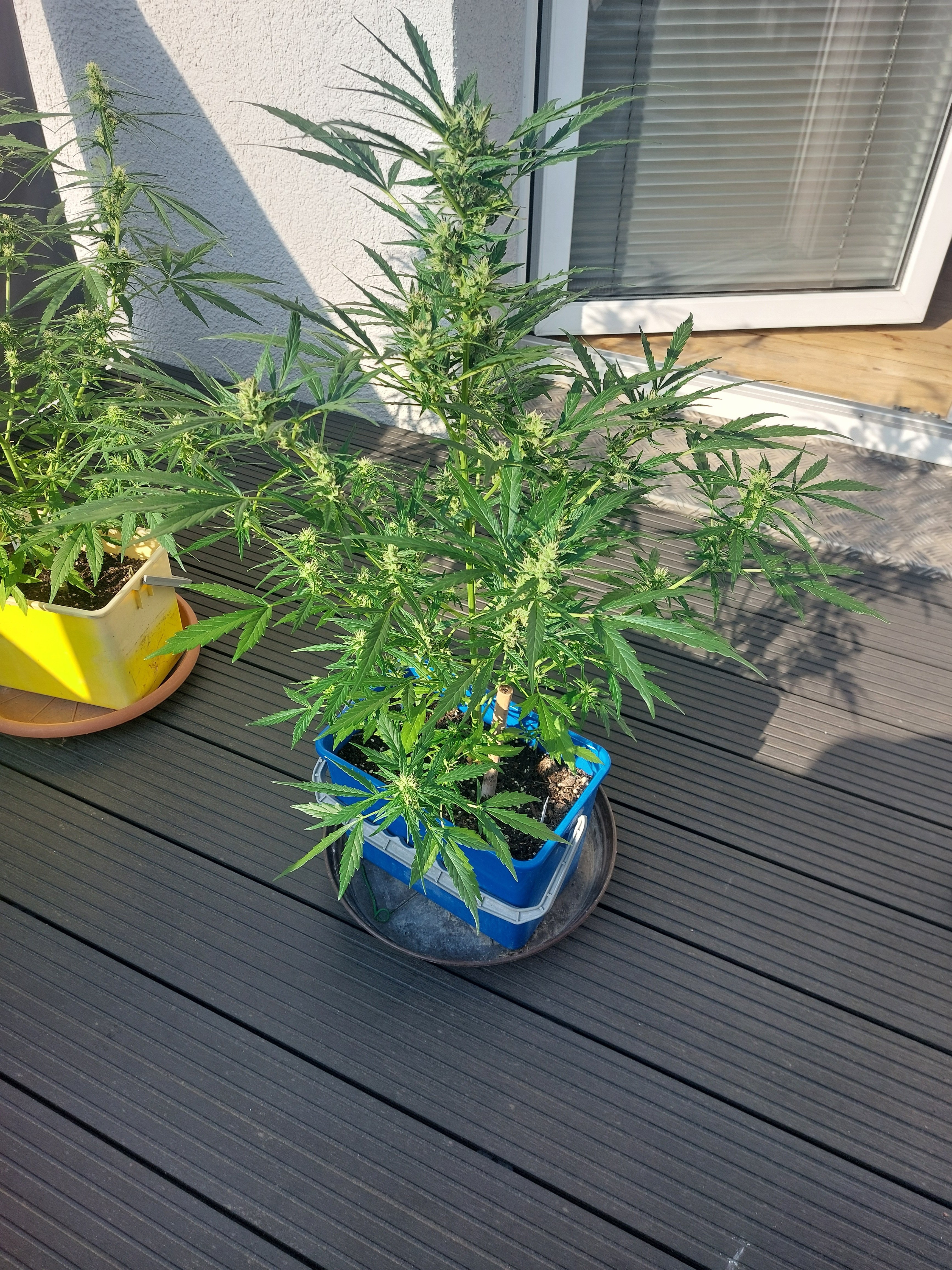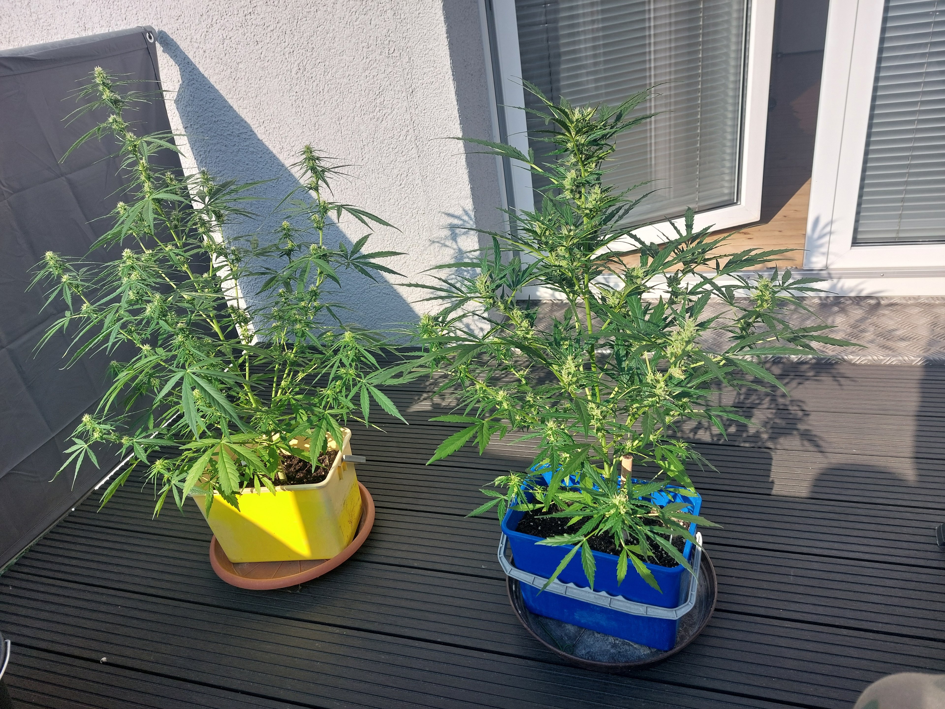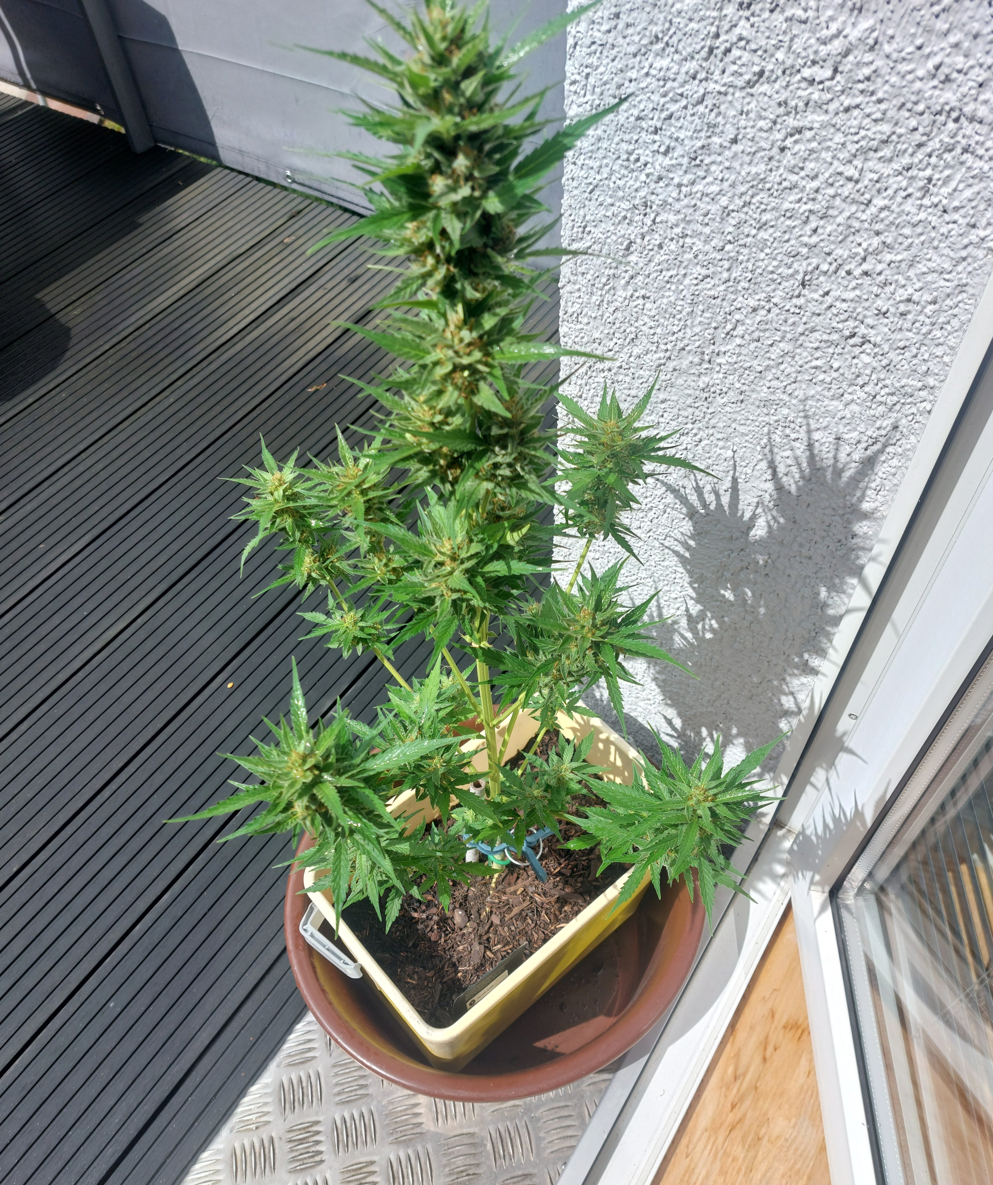 Wollte auch mal meinen 1. kleinen Grow hier zeigen: müsste jetzt 9. KW sein. Anfangs Fensterbank innen nach Osten, inzwischen aber Terasse mit Sonne aus Süd-Südwest. Banana Blaze...