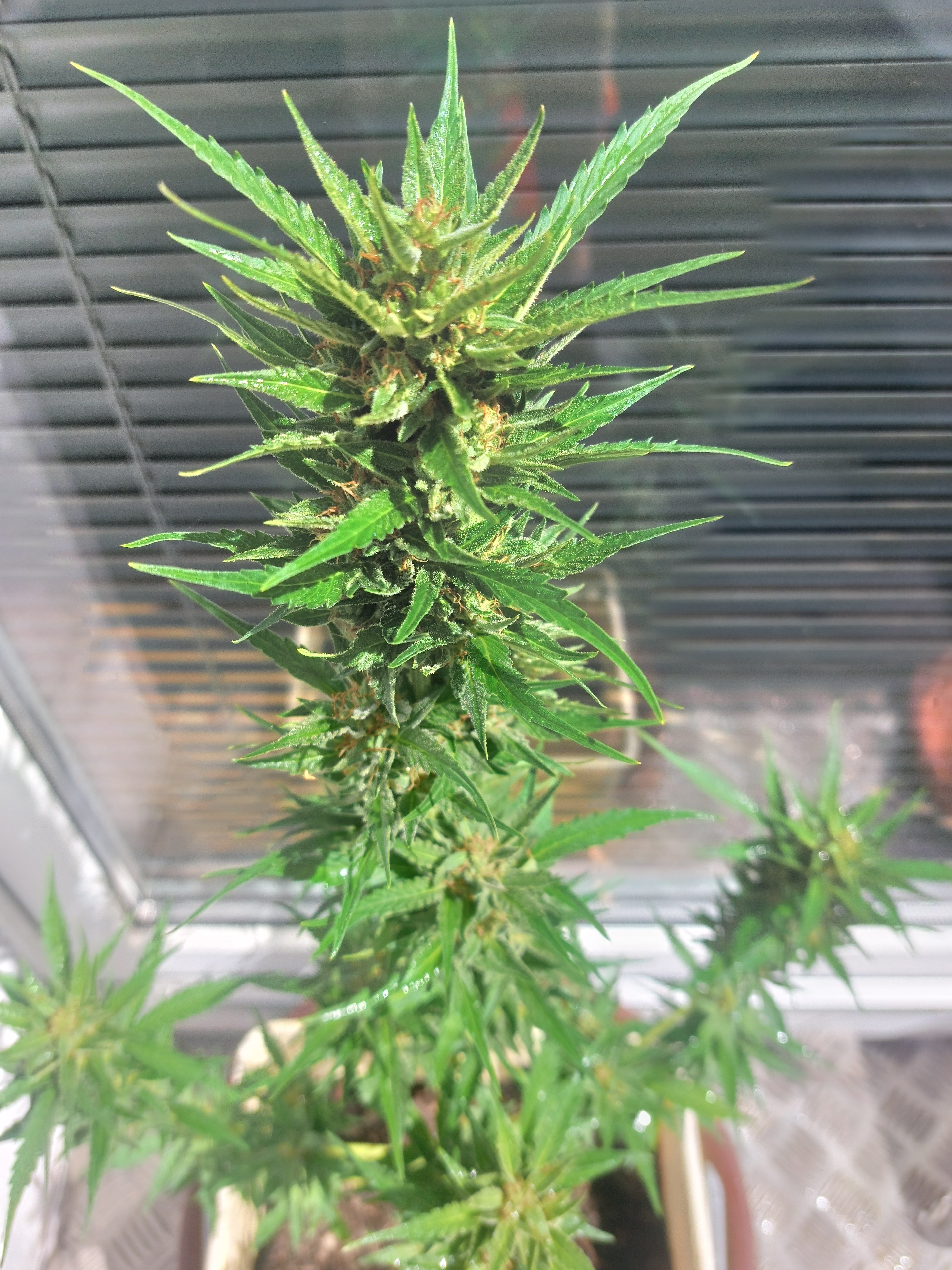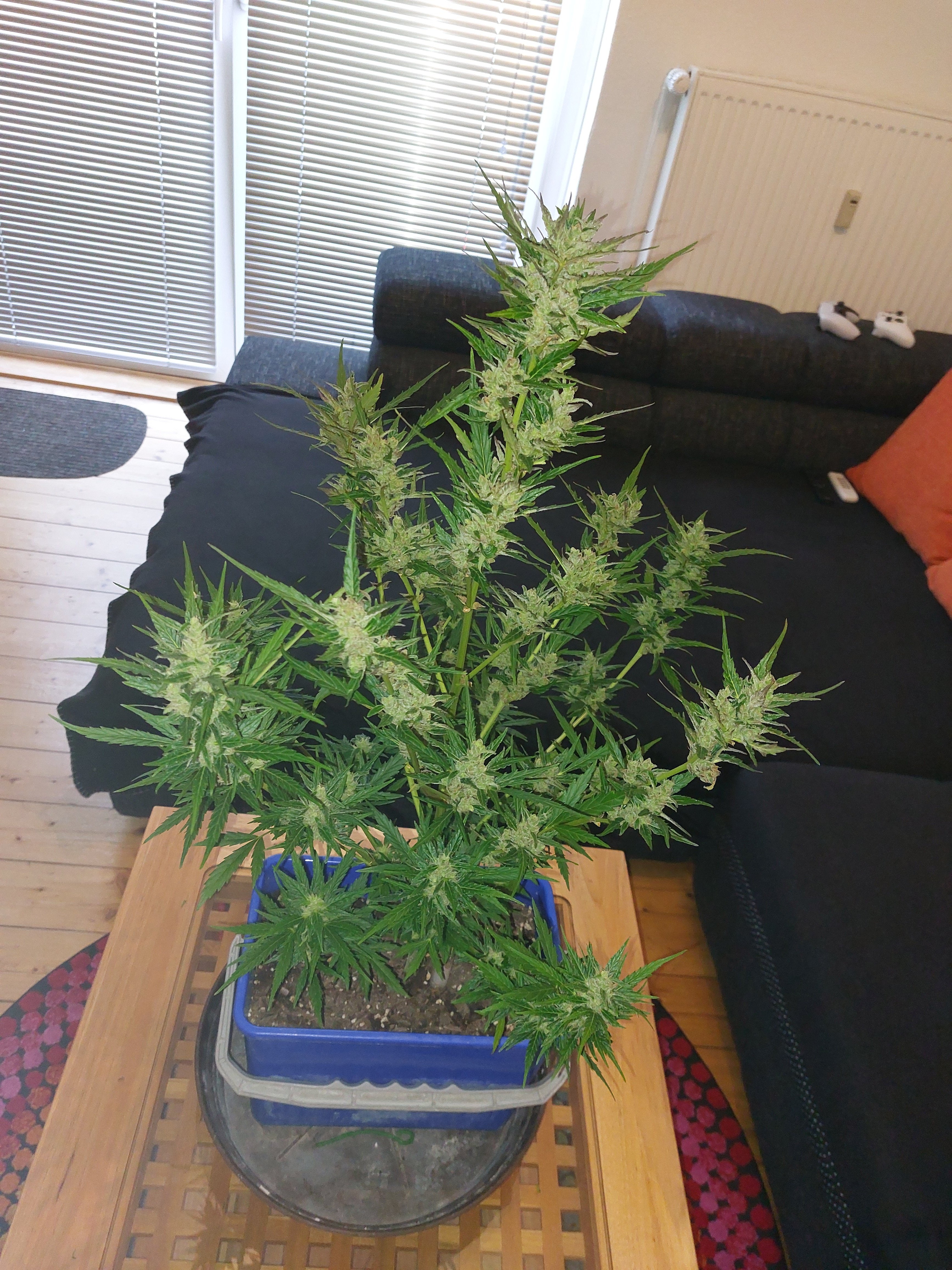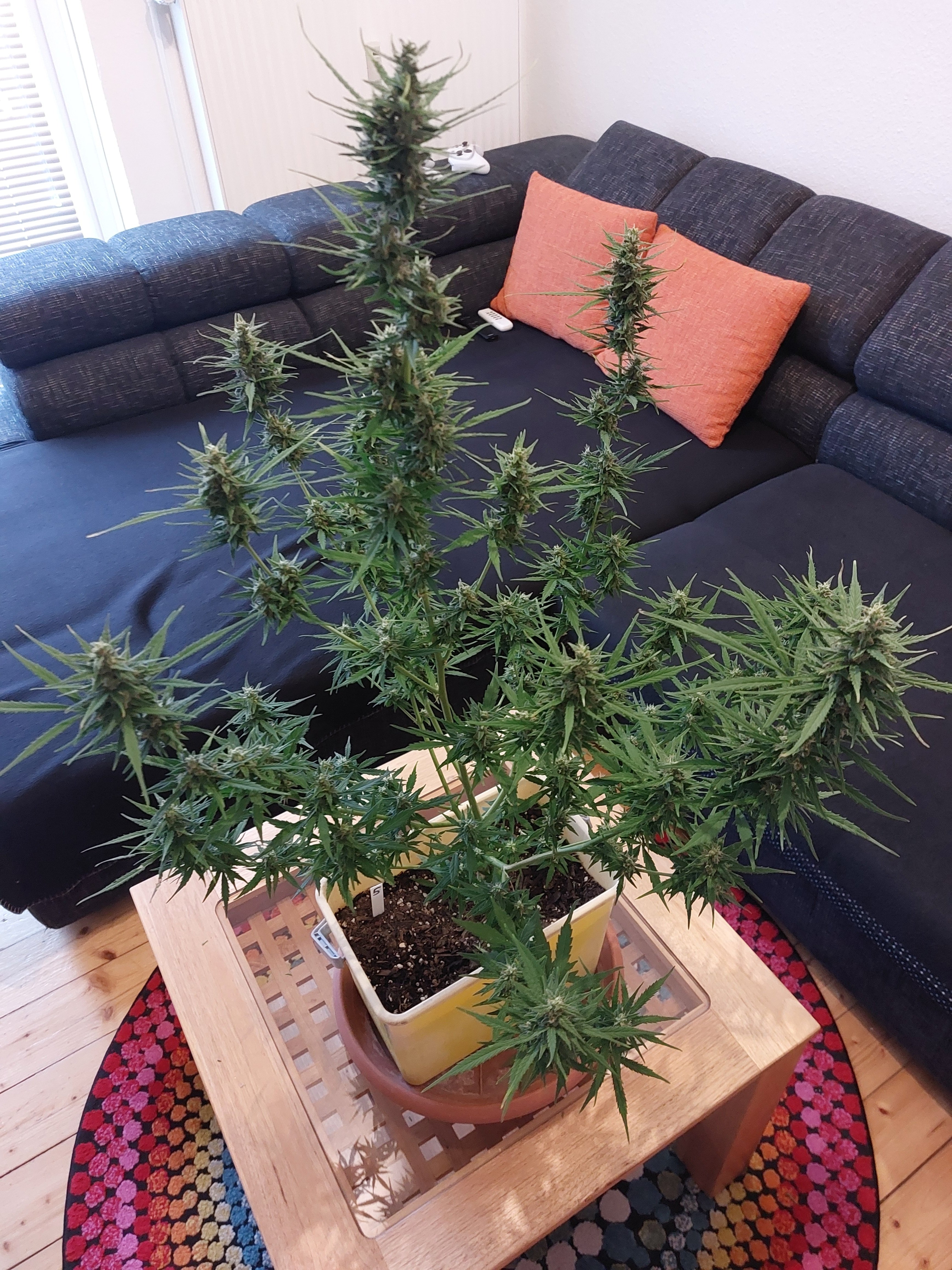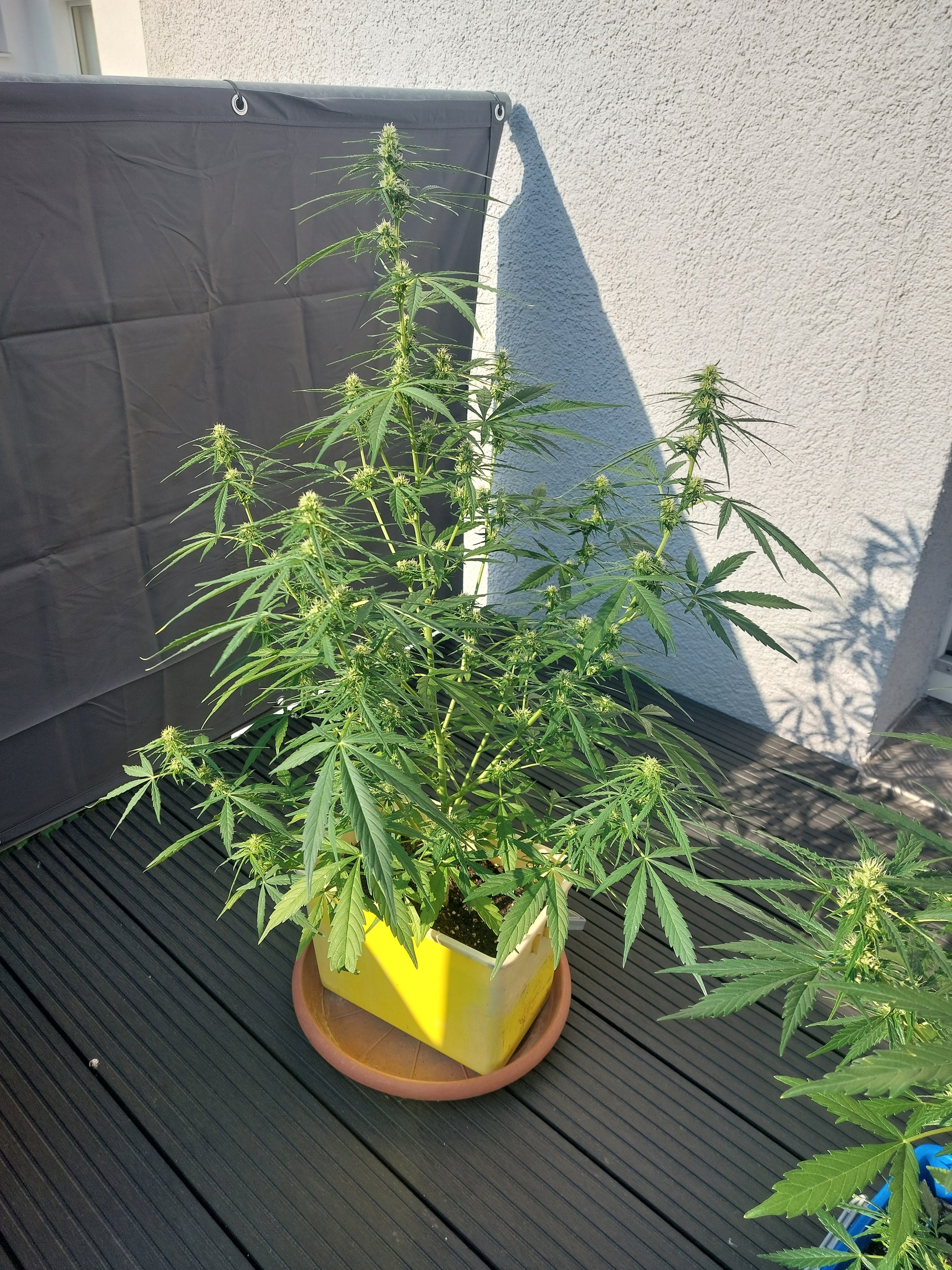 Wollte auch mal meinen 1. kleinen Grow hier zeigen: müsste jetzt 9. KW sein. Anfangs Fensterbank innen nach Osten, inzwischen aber Terasse mit Sonne aus Süd-Südwest. Banana Blaze...