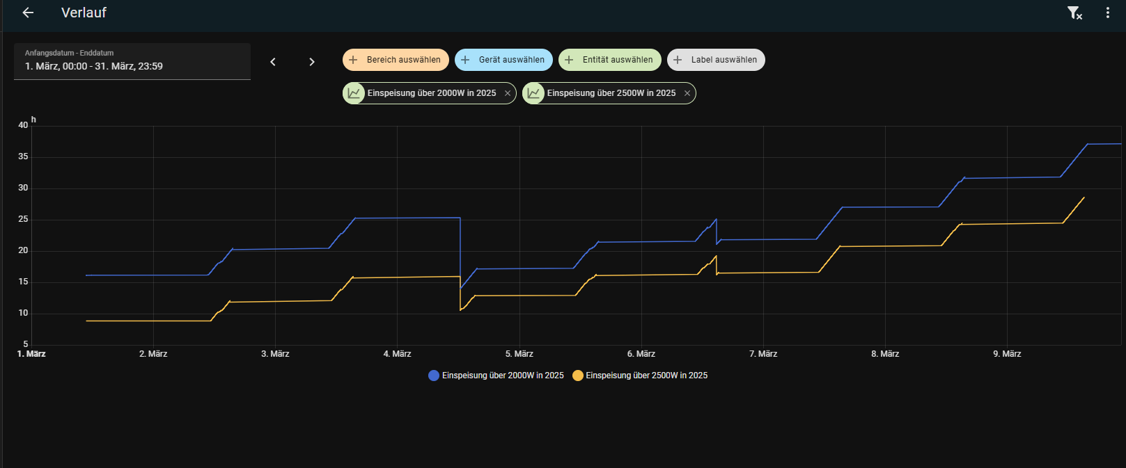 Bisher hat das einwandfrei funktioniert, aber am 4.3.25 und ein paar anderen Tagen wird die Stundenanzahl der Zähler nach unten korrigiert.