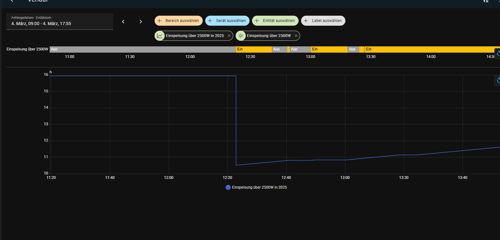 Wenn diese z.B. auf mehr als 2000W oder auch 2500W ansteigt, schaltet der Helfer ein. Damit steure ich verschiedene Dinge, z.B den Terrassenkühlschrank, das der quasi mit Solarstrom läuft.