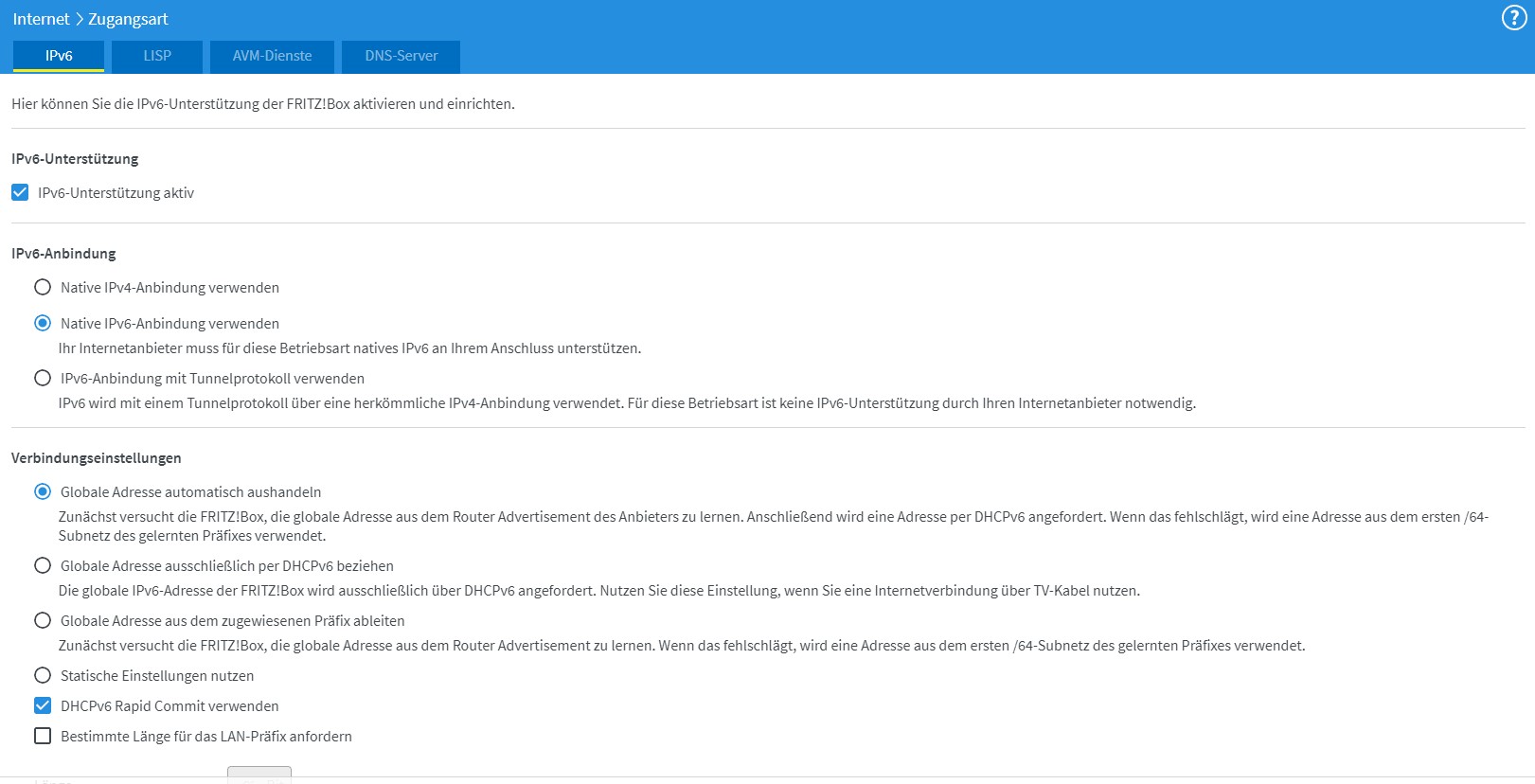 Kann mir jemand weiterhelfen, was da auf der neuen Einstellungsseite ggf. noch zu konfigurieren ist? Screenshot anbei, das war die Default-Einstellung, mit der haben aber hier intern schon nicht alle Geräte funktioniert. Aktuell hab ich es auf "IPv6-Anbindung mit Tunnelprotokoll verwenden" gestellt, dass war die einzige Einstellung, bei der ich im Heimnetzwerk keine Probleme mit den diversen Internetfähigen Geräten hatte.