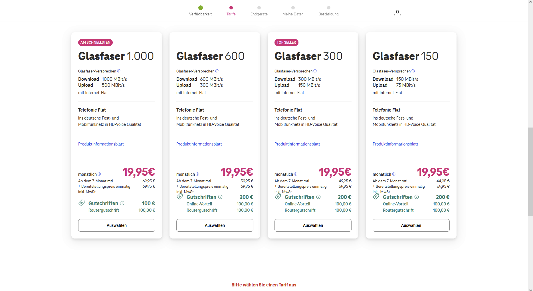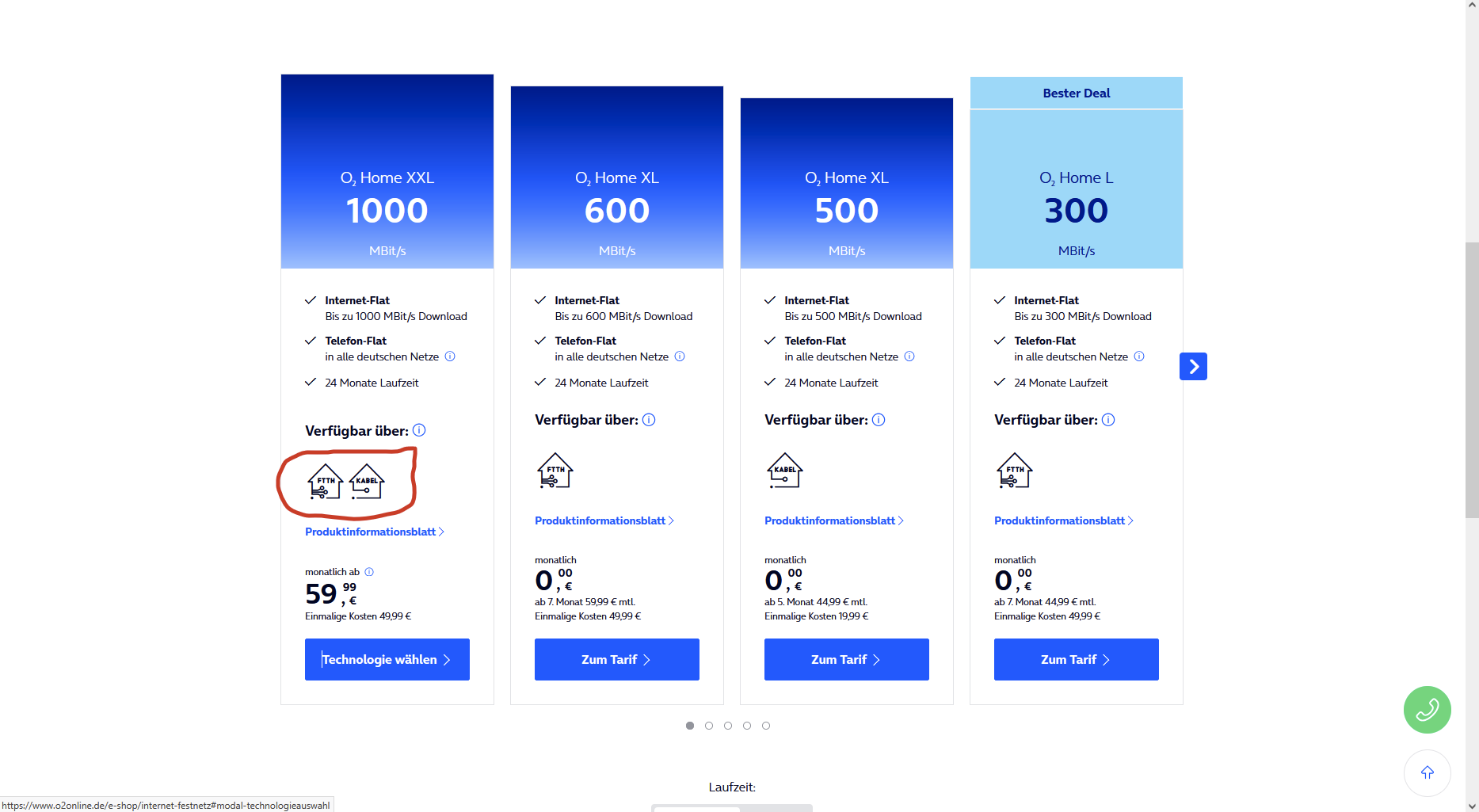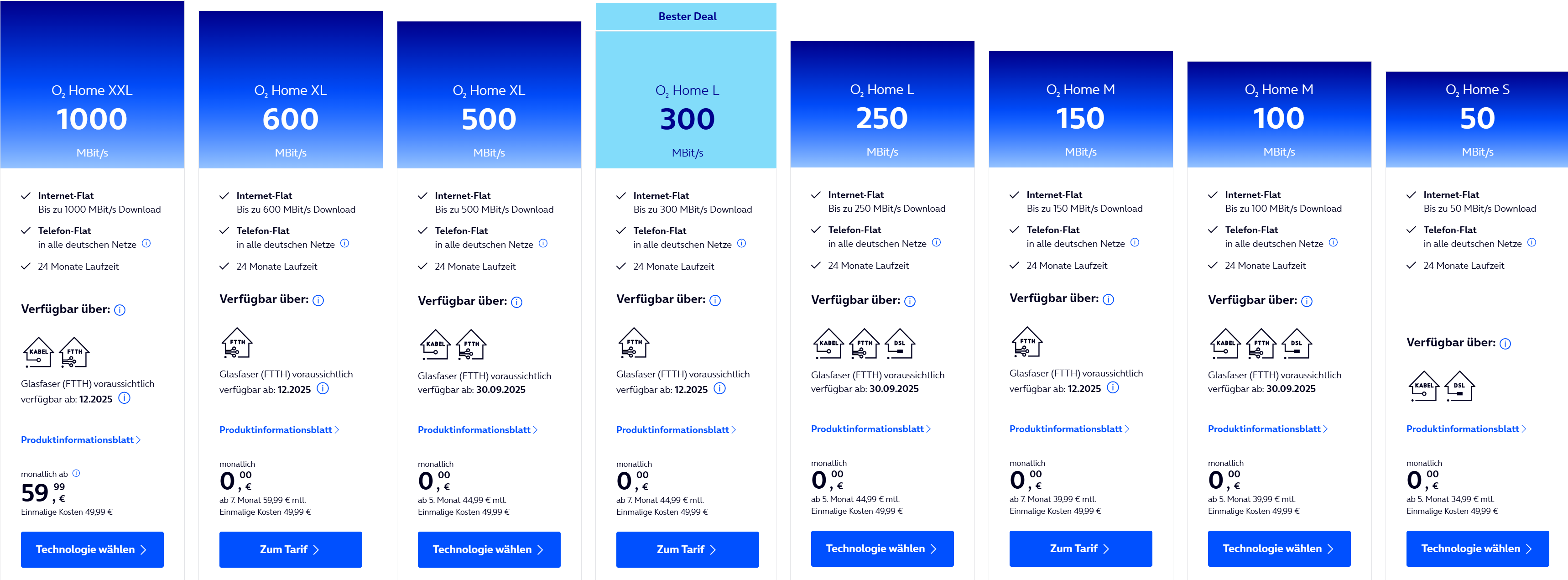 Aber ich bin grundsätzlich, was die Anschlussvielfalt angeht, ohnehin privilegiert (DSL (max. 100 MBit/s), Glasfaser und Kabel bis 1 GBit/s). Hier finde ich die Verfügbarkeitsanzeige bei O2 übrigens sehr gelungen, wo direkt angezeigt wird, welche Zugangstechnologien für welchen Tarif verfügbar sind.