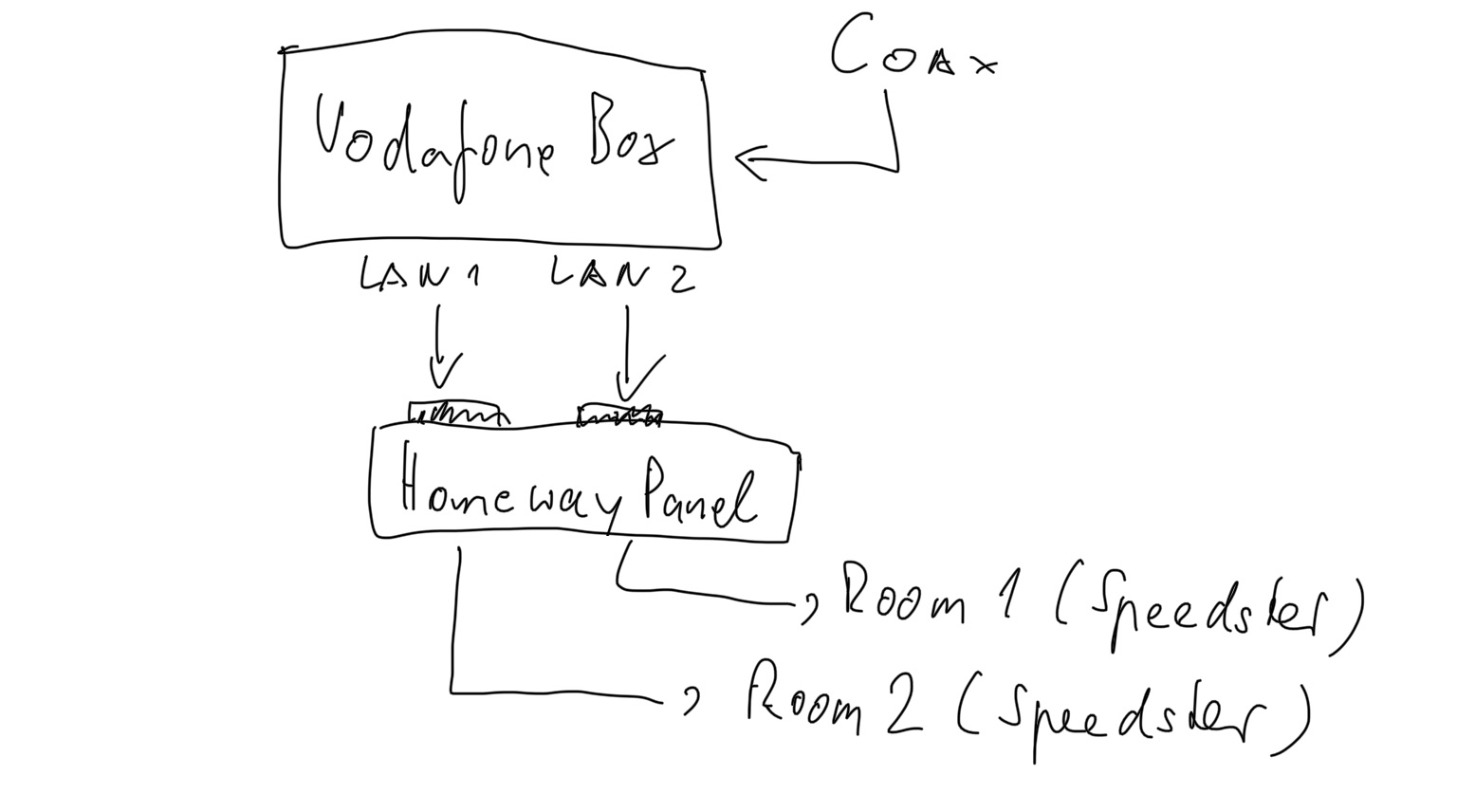 Hallo liebe community, ich versuche seit geraumer Zeit in unserer Mietwohnung ein Mesh Netzwerk aufzubauen. Die Situation ist folgendermaßen: im Flur ist ein Kasten mit Einem koaxial Kabel, welches in eine verteilerboxe geht. Von dort geht ein Anschluss in die Vodafone Box. Von der Vodafone Box gehen 2Y-Patch Kabel in ein Homeway System, Welches eine LAN Verbindung in alle Räume der Wohnung mit sich bringt. In zwei Zimmern habe ich einen Keenetic Speedster Router über LAN angeschlossen, Einmal als Router und einmal als Repeater. Das Signal funktioniert gut und das Internet wunderbar. Aber sobald ich die beiden in ein Mesh Netzwerk verbinden, funktioniert der Repeater nur noch im WLAN Modus. Nach Rücksprache mit Keenetic sagen Sie, dass das wohl an meiner Homeway Anlage liegt. Ich frage mich, ob es irgendeine Möglichkeit gibt, die beiden Route so zu verkabeln, dass sie ein Mesh Netzwerk über LAN aufbauen können. Ich habe mal zwei Bilder eingefügt, die das Szenario darstellen sollen. Ich bin nicht wirklich vertraut mit den ganzen Materie, versuche aber gerne rum. Liebe Grüße und vielen Dank