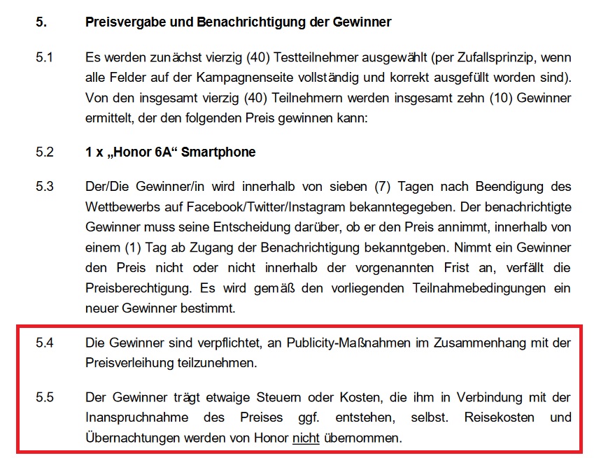 Ich bin mir sogar nicht mal sicher, ob das in Deutschland gültig ist. Das könnte schon fast gegen den § 4 Nr.6 des UWG verstoßen, der besagt dass die Teilnahme nicht an den Erwerb von Waren oder Diesntleistungen gebunden sein darf. Nimmt man an einem Publicity-Event teil, bei dem man auch noch die Kosten tragen muss, wäre das für mich eine Dienstleistung gegenüber Honor.