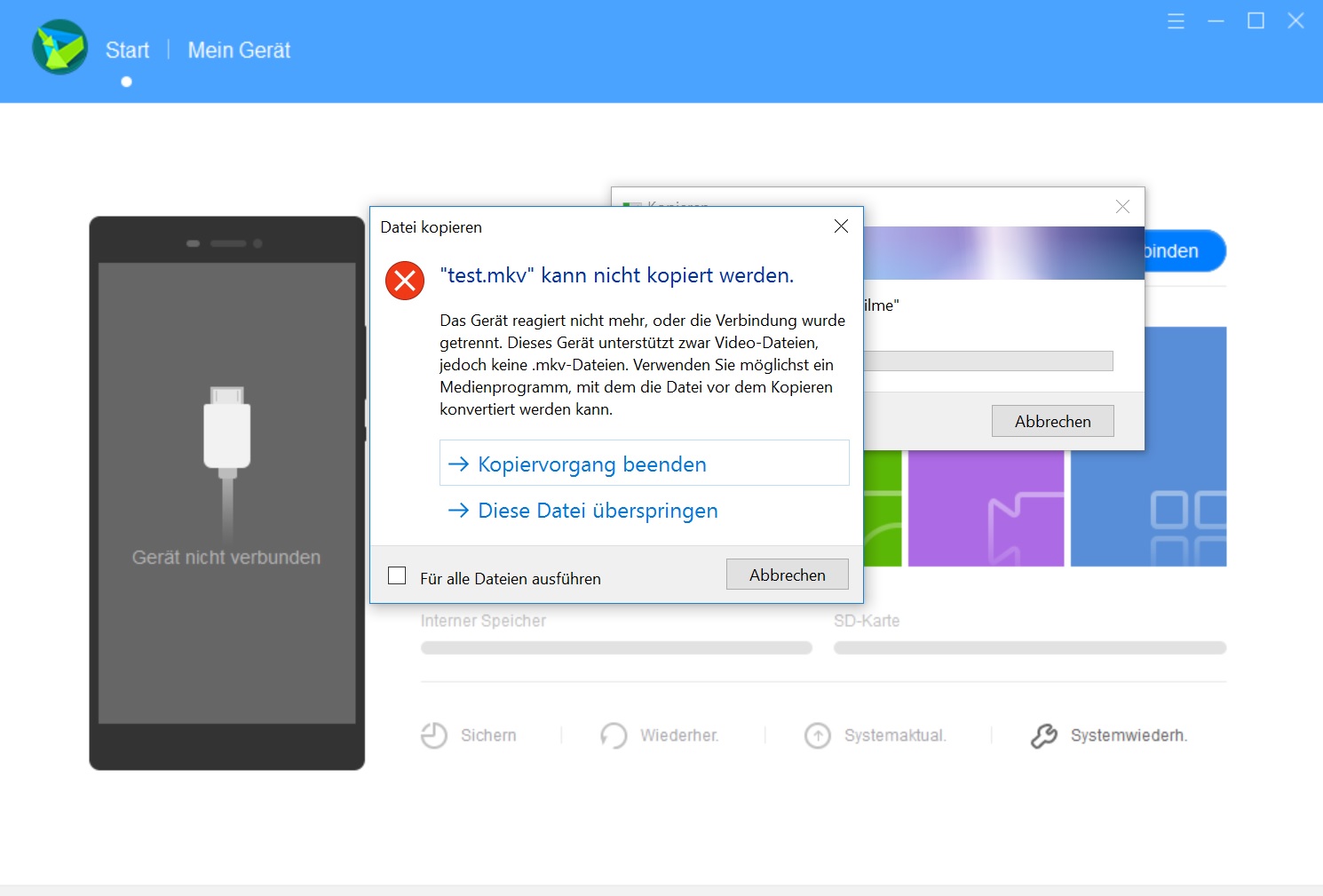 ) unterwegs. Um mir diese Zeit etwas angenehmer zu gestalten, schaue ich gerne auf meinem Honor 7 Dokus, Serien oder auch mal einen Film. Jedoch bricht der Kopiervorgang seit zirka nun einem Monat nach kurzer Zeit schon ab bzw. hängt sich zwischen drin immer wieder mal auf. So, als würde es sich trennen und gleich wieder verbinden. Seit gestern bekomme ich auch eine Fehlermeldung angezeigt, dass mein Gerät keine Dateien im mkv-Format unterstützen würde. Finde ich komisch, da bisher alles einwandfrei funktioniert hat. Im Anhang findet Ihr die genaue Fehlermeldung. Die HiSuite (Software von Honor) habe ich bereits neu installiert, jedoch hat das keine Besserung gebracht.