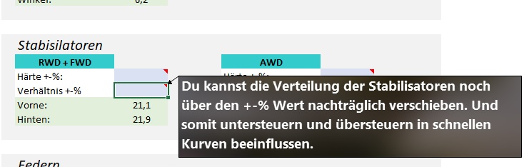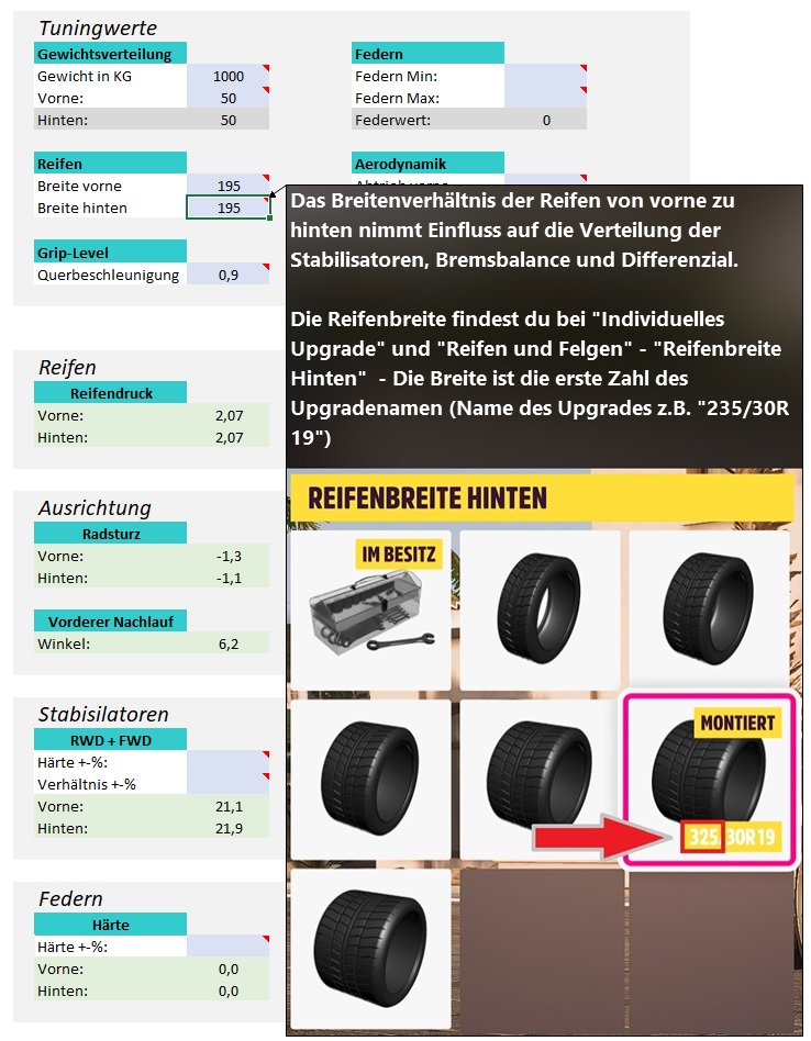 Gestartet als kleine Excel Tabelle um mir schnell die Federrate im Verhältnis zur Gewichtsverteilung vom Fahrzeug zu berechnen, ist daraus mittlerweile ein ausgewachsener Kalkulator für Asphalt-Tunings entstanden.