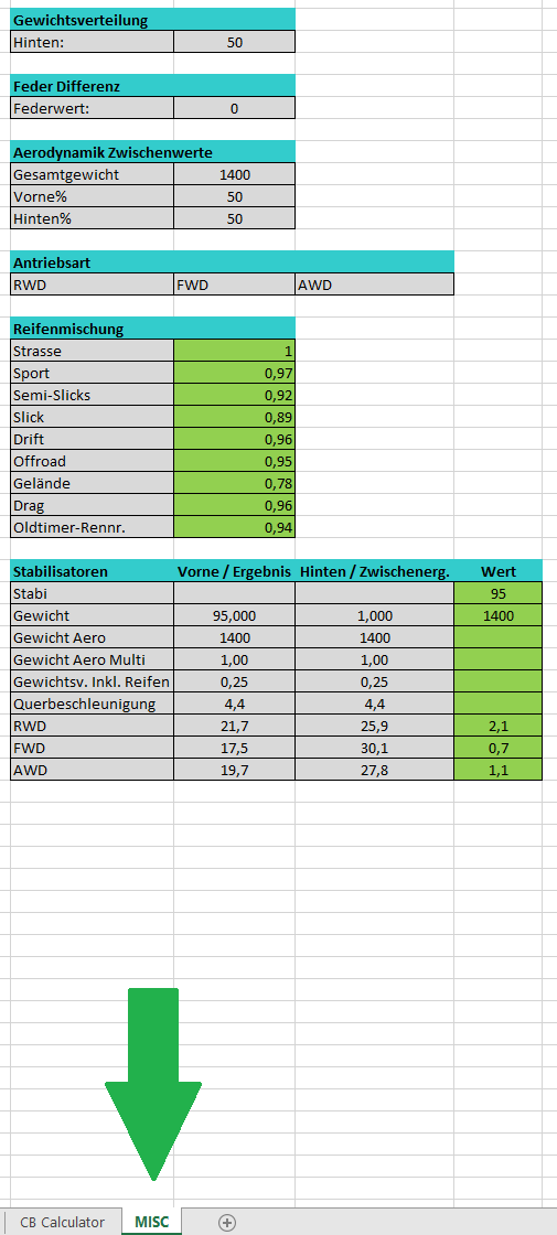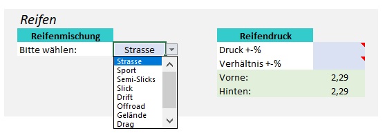 Die Ausgelagerten Werte kann man auf der zweiten Tabellenseite finden. Die grünen Felder sind zum einfachen anpassen gedacht. So könnt ihr eigene Werte für die Berechnung eintragen, wenn euch z.B. bei einer Reifenmischung der Druck für euch immer zu hoch oder niedrig ausgegeben wird.
