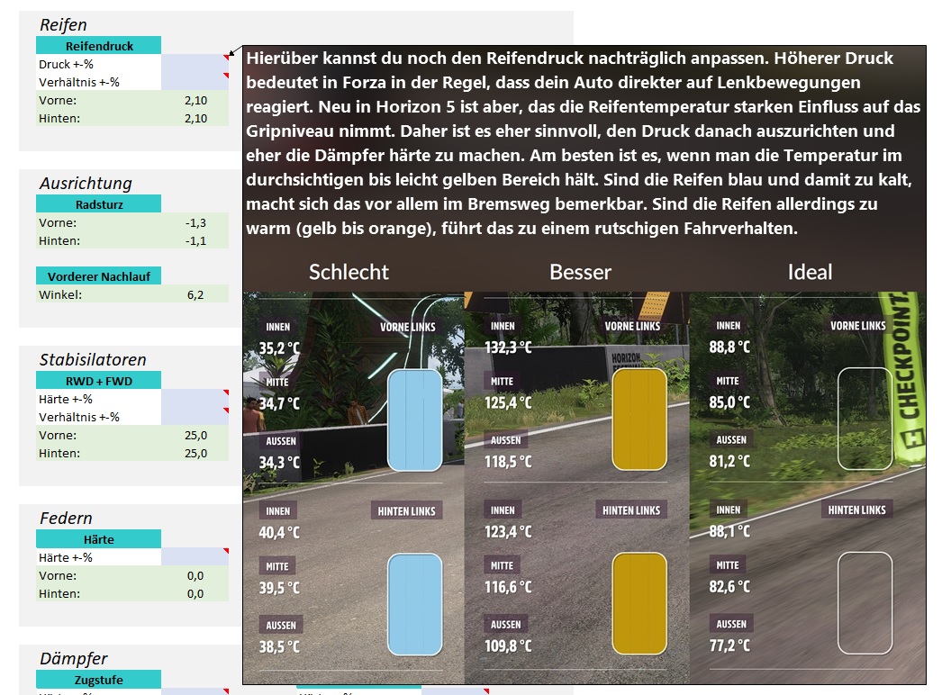 Darin liegt auch der Hund begraben: Bei Knapp über 500 Autos, die Horizon beinhaltet, ist es schwierig, eine Blaupause für alle zu finden. Deshalb kommt ihr um eigenes Feintuning nicht herum, wenn ihr die letzten Zehntel aus eurem Fahrzeug heraus kitzeln wollt, aber der Kalkulator sollte euch einen guten Startpunkt dafür bieten.