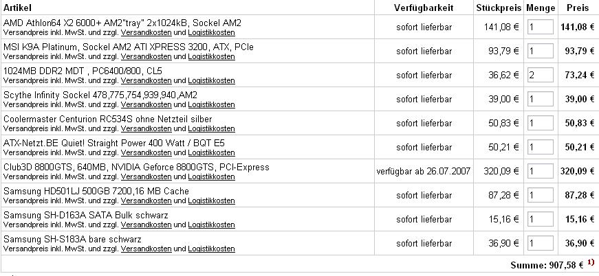 Kühler: Zalman CNPS9700 LED CU Sockel 775/754/939/940/AM2 43,46 < Besser als der nervige Boxed Kühler und auch für späteres OC gut geeignet