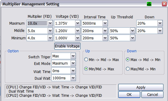 Bei Up Threahold und Down wird entschieden, aber welcher CPU Auslastung die höhere/untere Stufe geschaltet wird. Da ists jedem selbst überlassen. Möchtest du, dass die CPU so schnell wie möglich runterschaltet, dann bei Down den geringsten Wert nehmen. Bei Up analog, nur eben wann die CPU höher getaktet werden sollte. Bei Up würde ich die höchst verhandene Einstelllung nehmen. Bei Down die zweit unterste. Leider nutze ich RMClock, kann dir deswegen nicht richtwerte nennen.