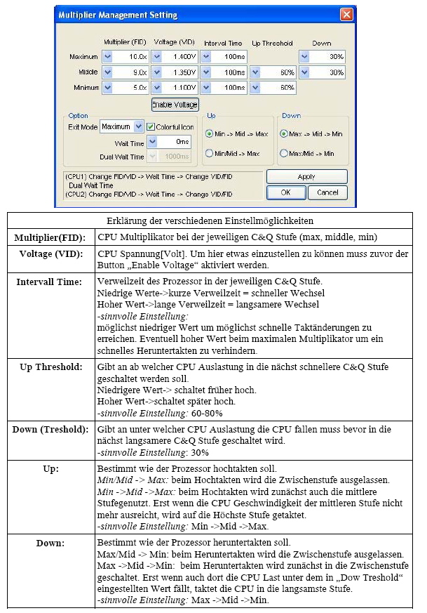 Bei swith triger, wait time und dual time kann ich dir leider nicht helfen. Wenn Screen von dem Multi Management nach würde wait time die Zeit bedeuten, die nach einem schalten des Multi abgewartet wird (da wird der Multi est einmal nicht verändert), bis der Multi wieder geschaltet wird. Dual time würde dann bedeuten, es wird nach dem zweiten Schalten gewartet. Sinnvoll zB damit die CPU zu oft den Takt ändert, was auch einen Sinn hat. Denn jedes Mal wenn die CPU den Takt ändert, kostet das Zeit und je nach Anwendung kannst du das auch wahrnehmen.