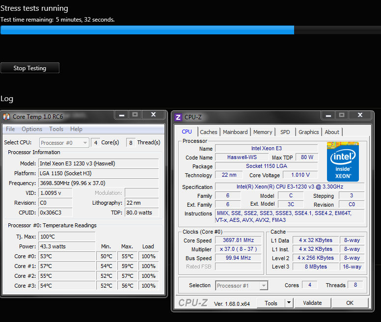 Getestet werden kann mit Spielen, Prime95 oder direkt per "Stresstest" in dem intel Tool.