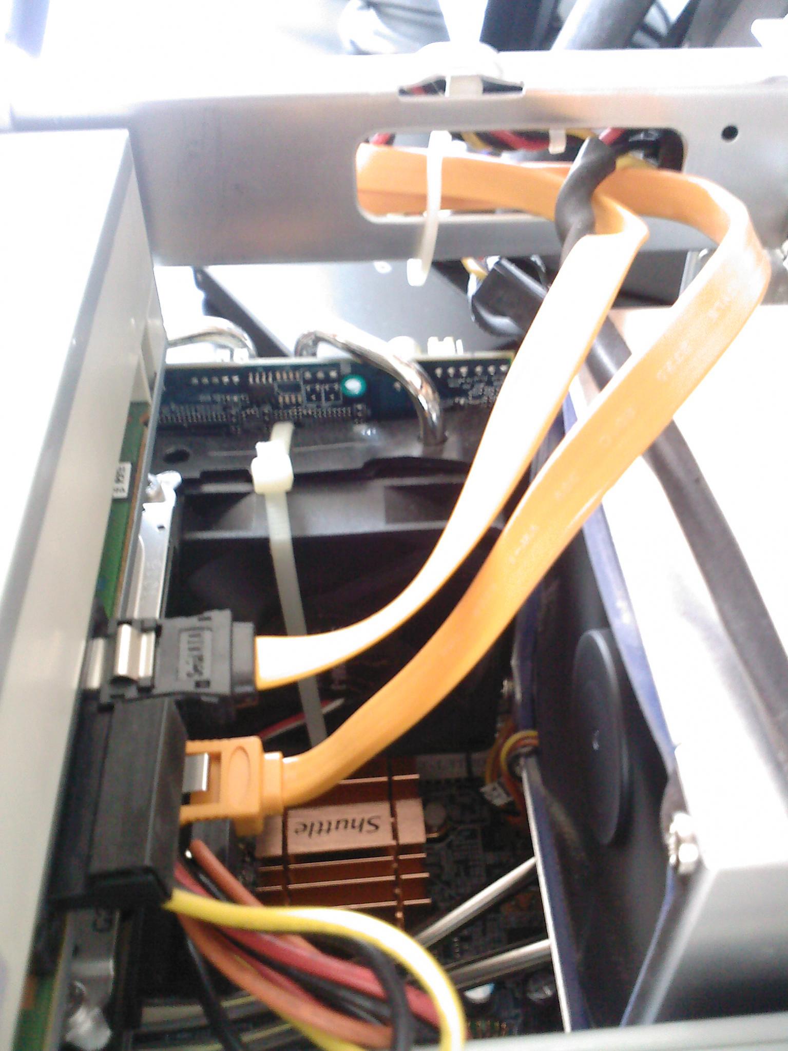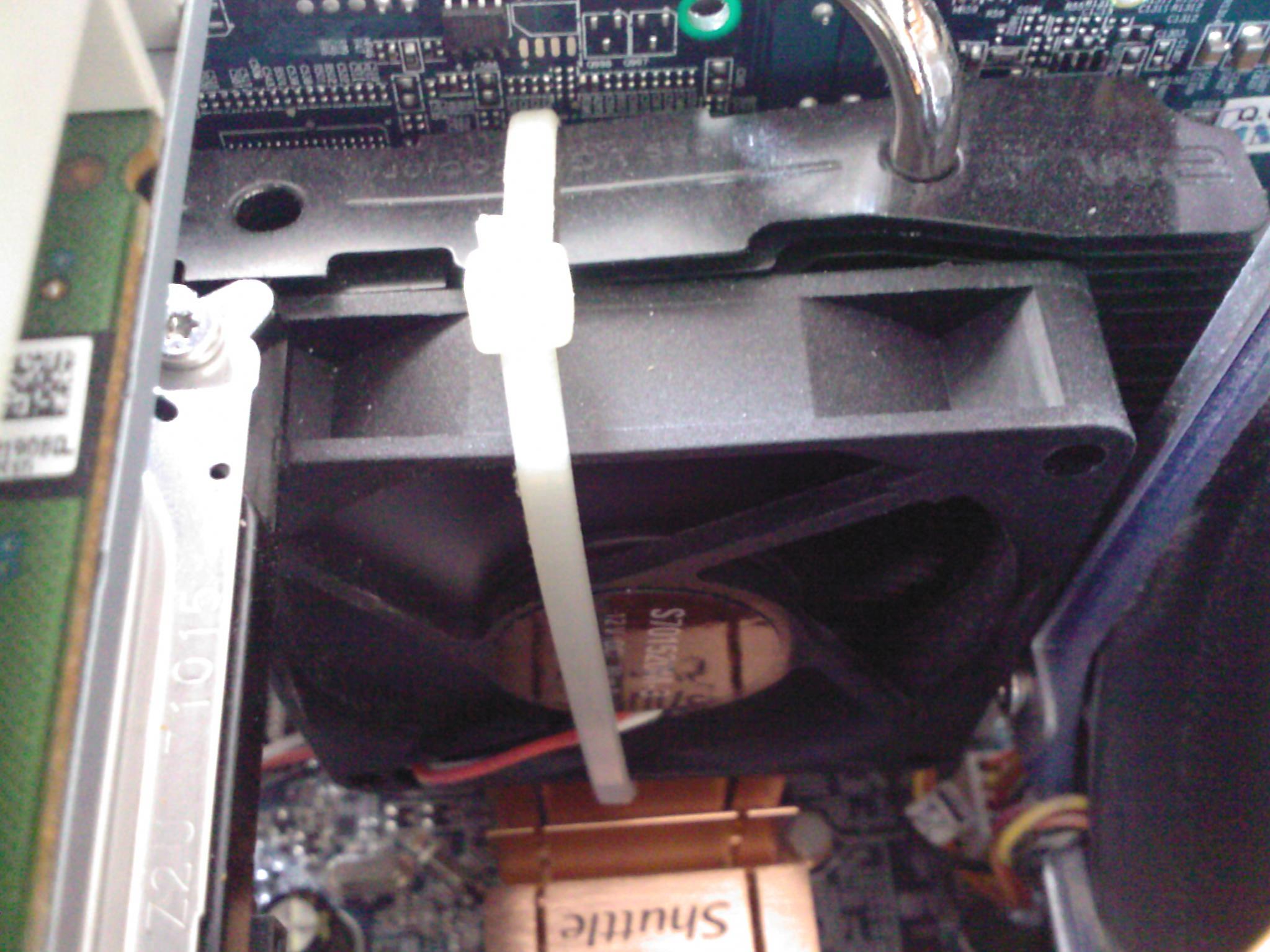 Nachdem alles da war und auch eingebaut, gab es endlich das was von Begin an das Topziel war: Ruhe! Der Scythe Lüfter war deutlich leiser und auch der Luftdurchsatz war besser. (Idle läuft der Lüfter auf 800rpm unhörbar, unter Prime mit ca. 1250rpm immer noch kaum zu hören). Das Hauptproblem war hier der Einbau des 70mm Lüfters. Der Shuttle ist wirklich klein! Das Problem: Der Lüfter muss eingesetzt werden wenn der Laufwerksschacht schon drin ist. Zwischen Kühler und Laufwerksschacht sind gerade einmal 17mm Platz. Es ist alles sehr eng aber wie im Bild zu sehen ist, passt es! Mit 7V angeklemmt läuft der Sharkoon Lüfter auch bei ca. 1000 rpm, und da er so klein ist hört man ihn nicht einmal wenn das Ohr direkt daneben ist. Die Grafikkarte war nach dem umbau ca. 12 Grad kühler, selbst 4h Furmark an einem warmen Sommertag sind jetzt kein Problem.