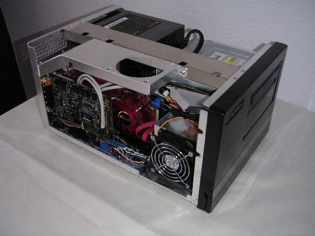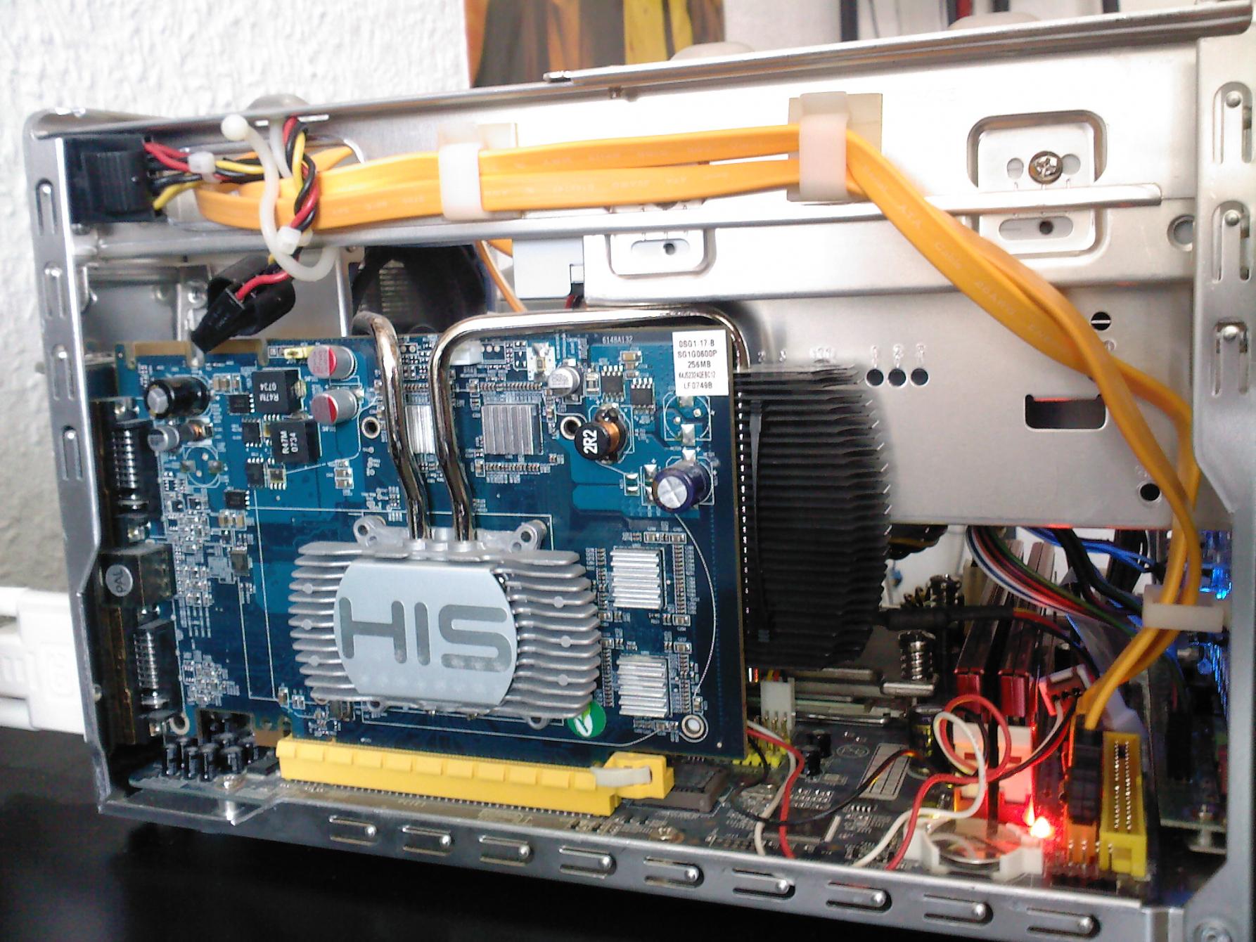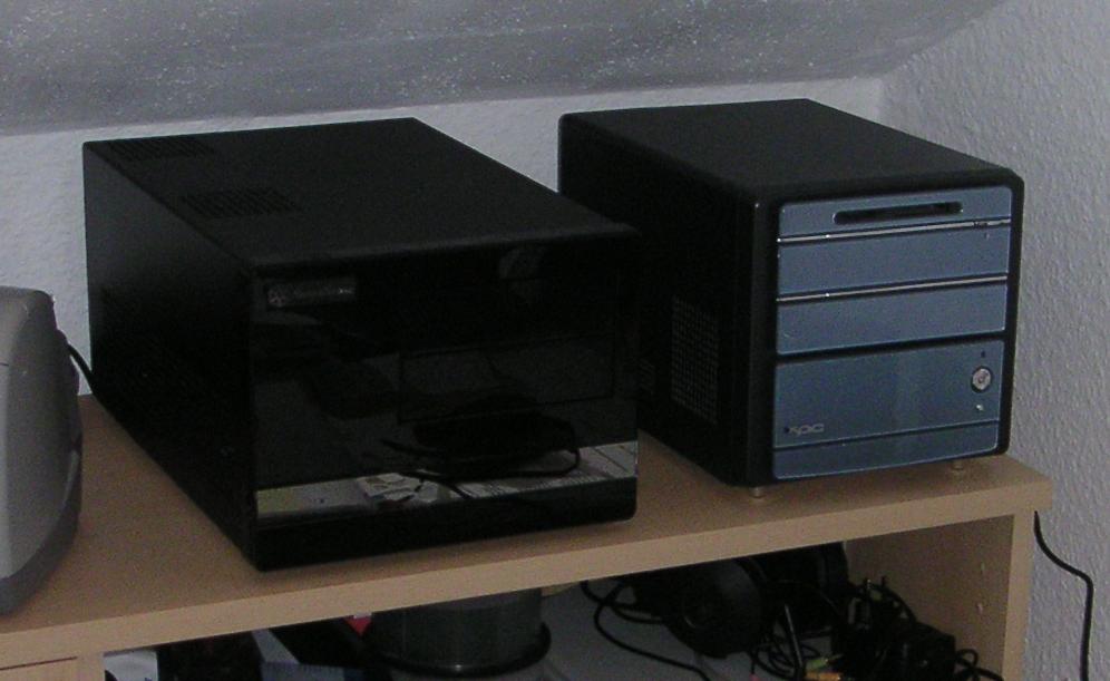 Meine Wahl viel letztendlich auf einen Shuttle XPC SN68SG2 Barebone. Damals waren ITX noch nicht so verbreitet und letztendlich hätte ich für Mainboard + Gehäuse + Netzteil+ leisen CPU Kühler etwa das gleiche ausgegeben. Da der PC auch leise sein sollte entschied ich mich zu einem sparsamen 45W CPU zu greifen. Weitere Komponenten waren eine 2600XT ATI von HIS passiv gekühlt (die hatte ich mir 2 Tage später besorgt nachdem alles ausgemessen war). 2GB RAM sowie eine 250GB HDD welche recht leise sein sollte.