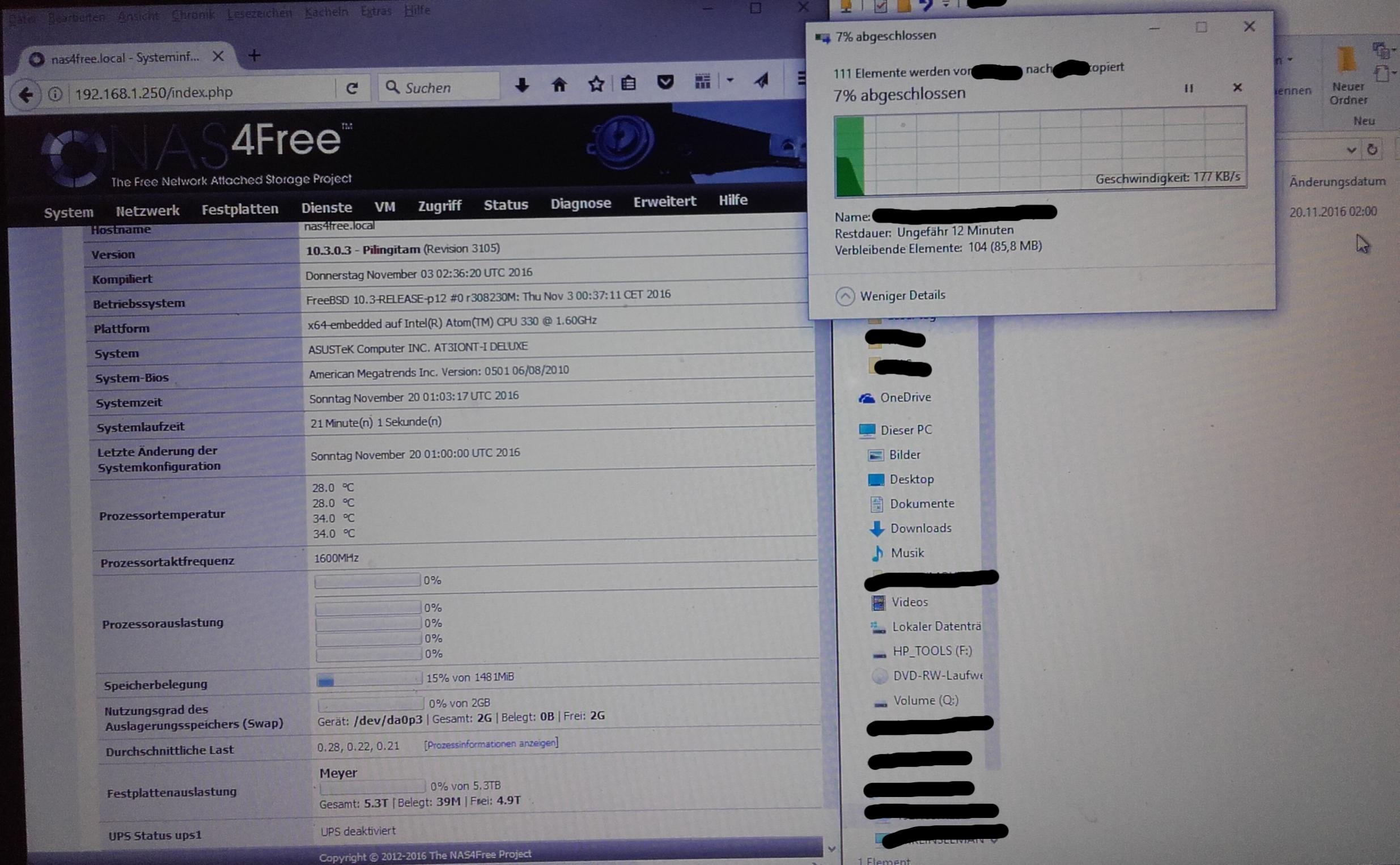 Ich kann das Laufwerk im Netzwerk finden und auch kleine Datei bis 1 MB schnell kopieren. Aber wenn ich größer Daten kopieren will (1 GB) geht die Kopiergeschwindigkeit in den kbis-Bereich runter und wird dann abgebrochen weil dem NAS nicht mehr antwortet. Die CPU-Auslastung des NAS liegt bei 0 % und die Arbeitsspeicher- Auslastung bei 15 %.