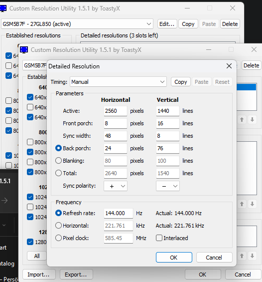 Ich nutze derzeit noch einen LGGL850, 1440p/144hz, 7900XTX und habe nach der Berechnung ein Blanking zwischen 103-105. Sobald ich bei CRU etwas mache, taucht das oben beschriebene Probleme auf und mein PC wird unglaublich träge.