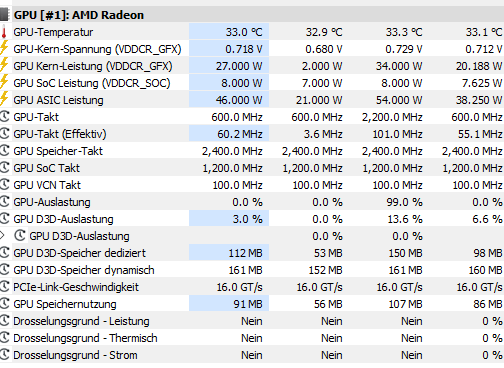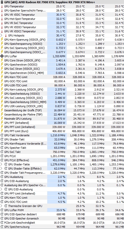 die jeweilige Takt-Frequenz des VRAMs und ggf. auch den jeweiligen Verbrauch.