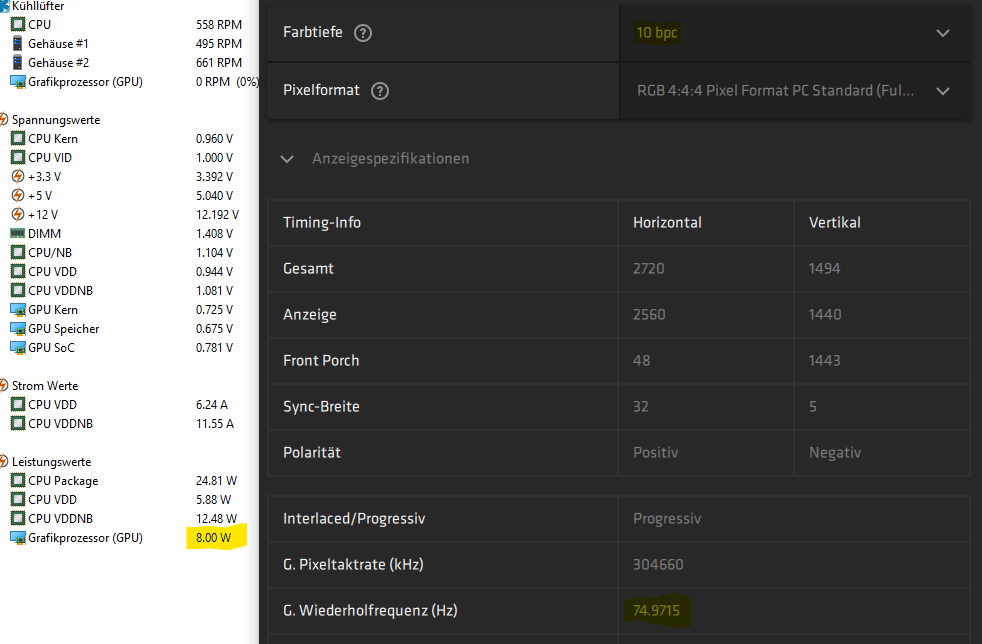 Ich bin limitiert vom maximalen Pixelclock (1070 MHz). Mit 117 Hz und 123 Blanking bekomme ich 50MHz RAM Idle und 9W!