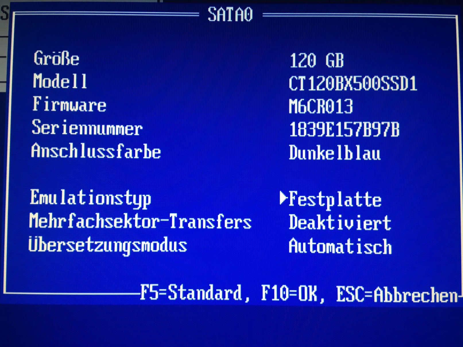ich habe in einen alten Computer "HP Compaq dc7800 Convertible Minitower PC" bei dem die HDD defekt war eine SSD 120GB Crucial BX500 (2.5" (6.4cm) SATA 6Gb/s CT120BX500SSD1) eingebaut. Die SSD wird auch im Bios erkannt.