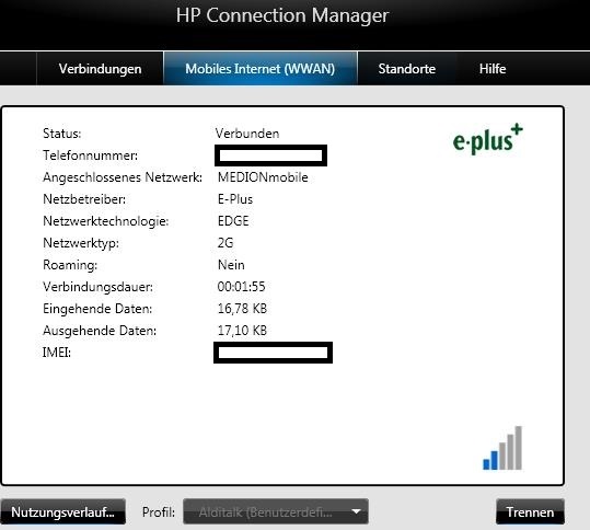 Wenn die Karte im Notebook installiert ist, sieht der HP Connection Manager das Netzwerk. Ein Klick auf Verbinden scheint zu funktionieren. Alles sieht gut aus, aber SMS kommen nicht durch.