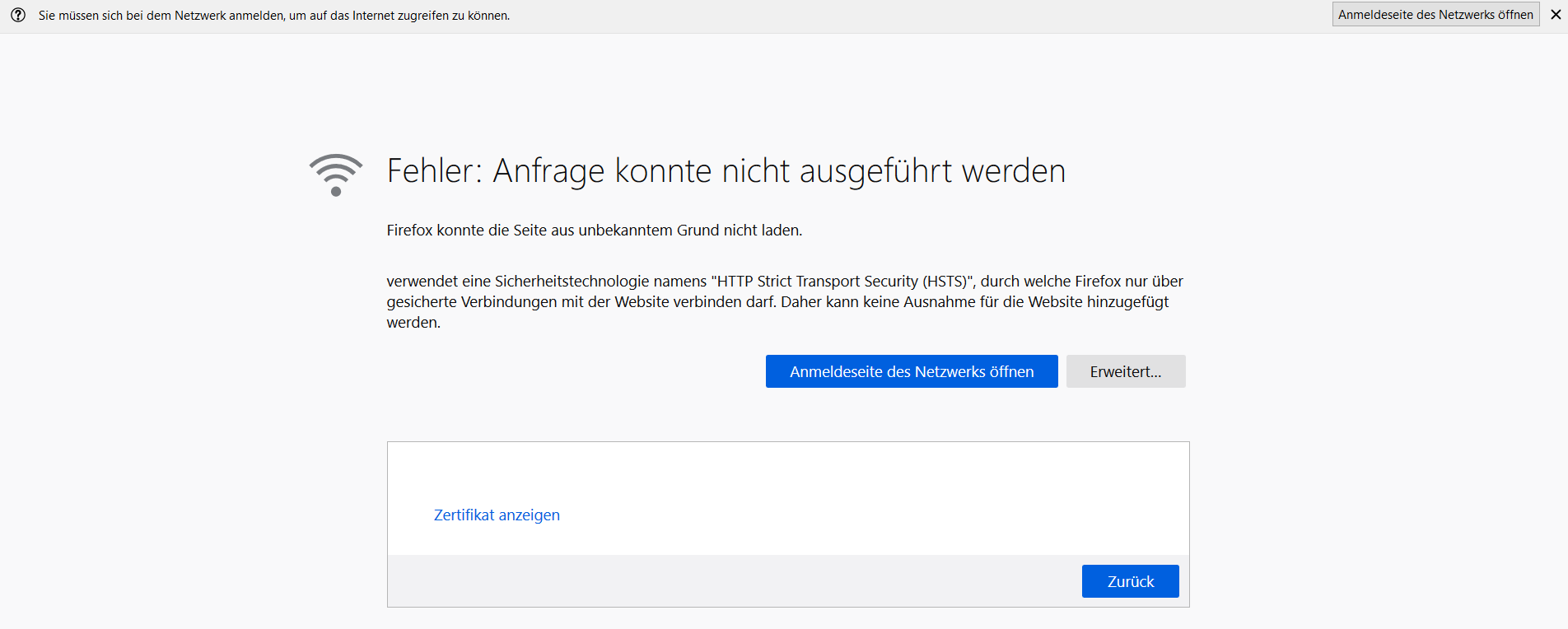 Bei öffentlichem WLAN / Wi-Fi kann ich mich nicht anmelden, da keine Verbindung zur Anmeldeseite aufgebaut werden kann.
