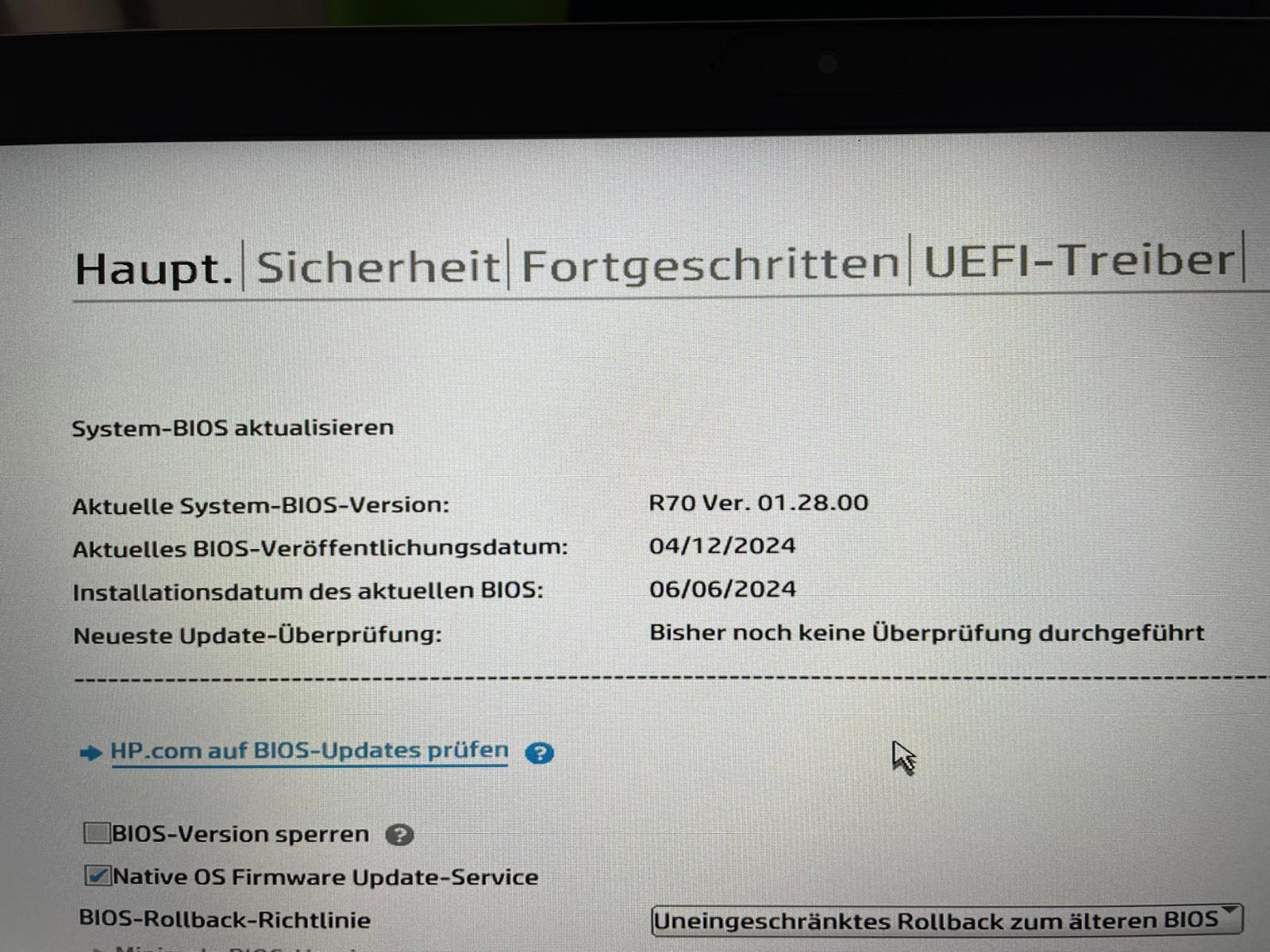 Bios des EliteBook 850 G6 ist aktuell und auf Werkseinstellungen gesetzt.