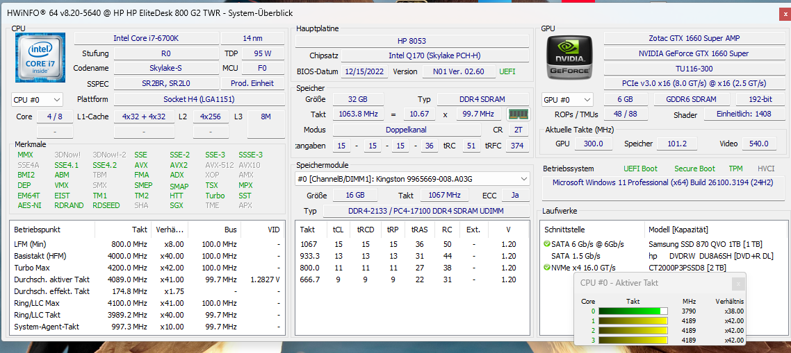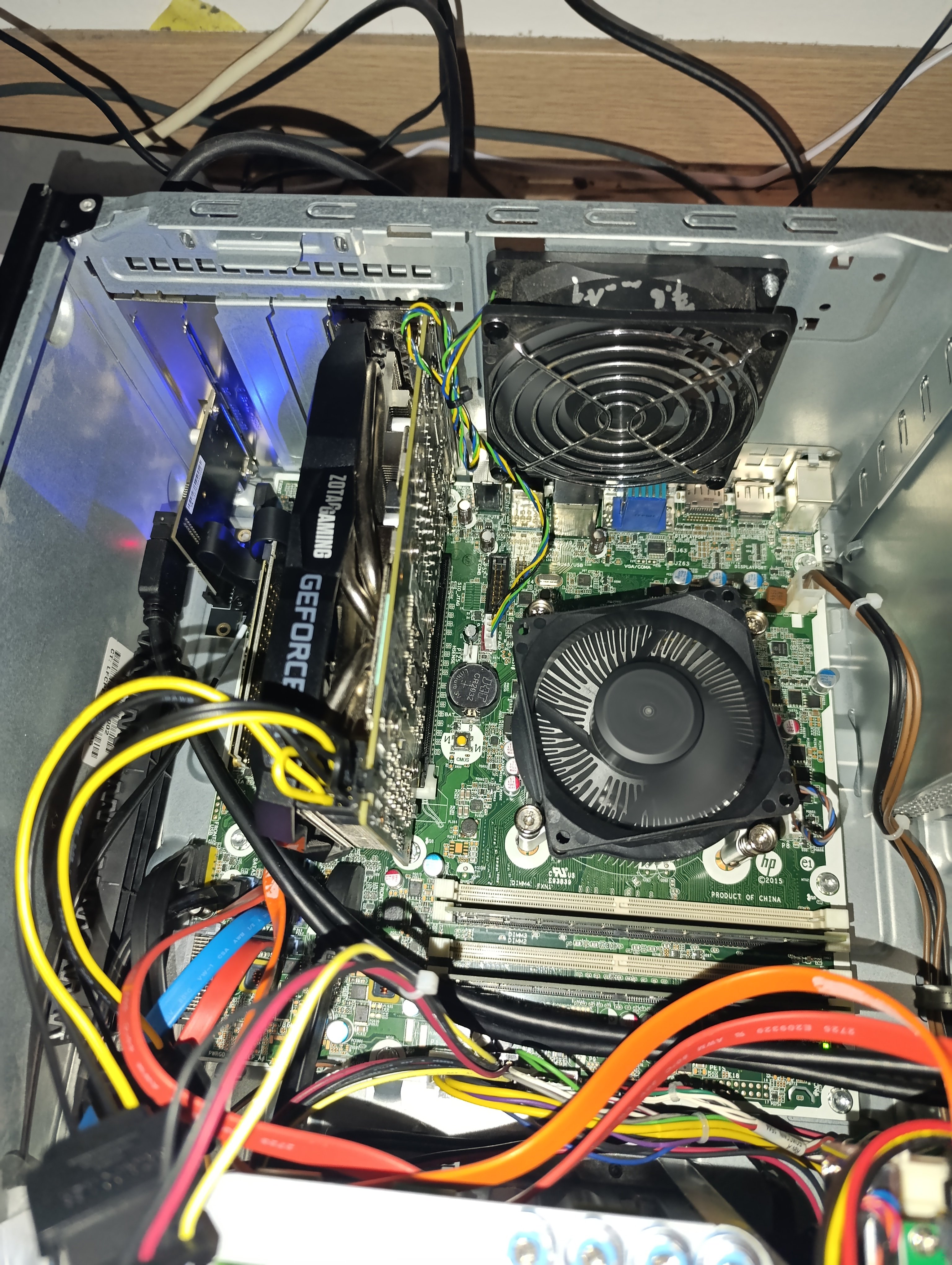 Ich hatte schon mal einen hp EliteDesk 800 G2 TWR umgebaut, allerdings ging es mir damals rein um die technische Seite, was man alles machen kann. Dieses Mal wollte ich noch einen Schritt weiter und wirklich das Maximum rausholen, an Werkzeugeinsatz sollte es keine Tabus geben. Es sollte ein i7-6700K (mehr als sechste Generation Skylake kann das Mainboard leider nicht) werden. Letztes Mal war es nur ein 6700 ohne K, weil ich den Umbau auf einen stärkeren Cooler scheute. Das Chassis hat nämlich eine integrierte Befestigung für den originalen hp-Cooler, die irgendwelchen Backplates im Wege steht. Da ich eh mit der Bohrmaschine die Nieten entfernt hatte um Gehäuseschale und Chassis voneinander zu trennen, und da ich mit der Flex den unteren Laufwerkskäfig entfernt hatte um Platz für eine Grafikkarte zu schaffen, habe ich dieses Mal auf der Rückseite des Chassis noch vier schnelle Schnitte gemacht, womit Platz für eine beliebige Backplate wurde. Bilder hiervon muss ich nachreichen, da ich beim eigentlichen Umbau keine Fotos gemacht habe. Auf alle Fälle passen nun beliebige Cooler mit bis zu 145 mm Höhe ins hp-Gehäuse. Bei mir ist es letztendlich ein Thermalright Silver Soul 135 mit 6 Heatpipes geworden.