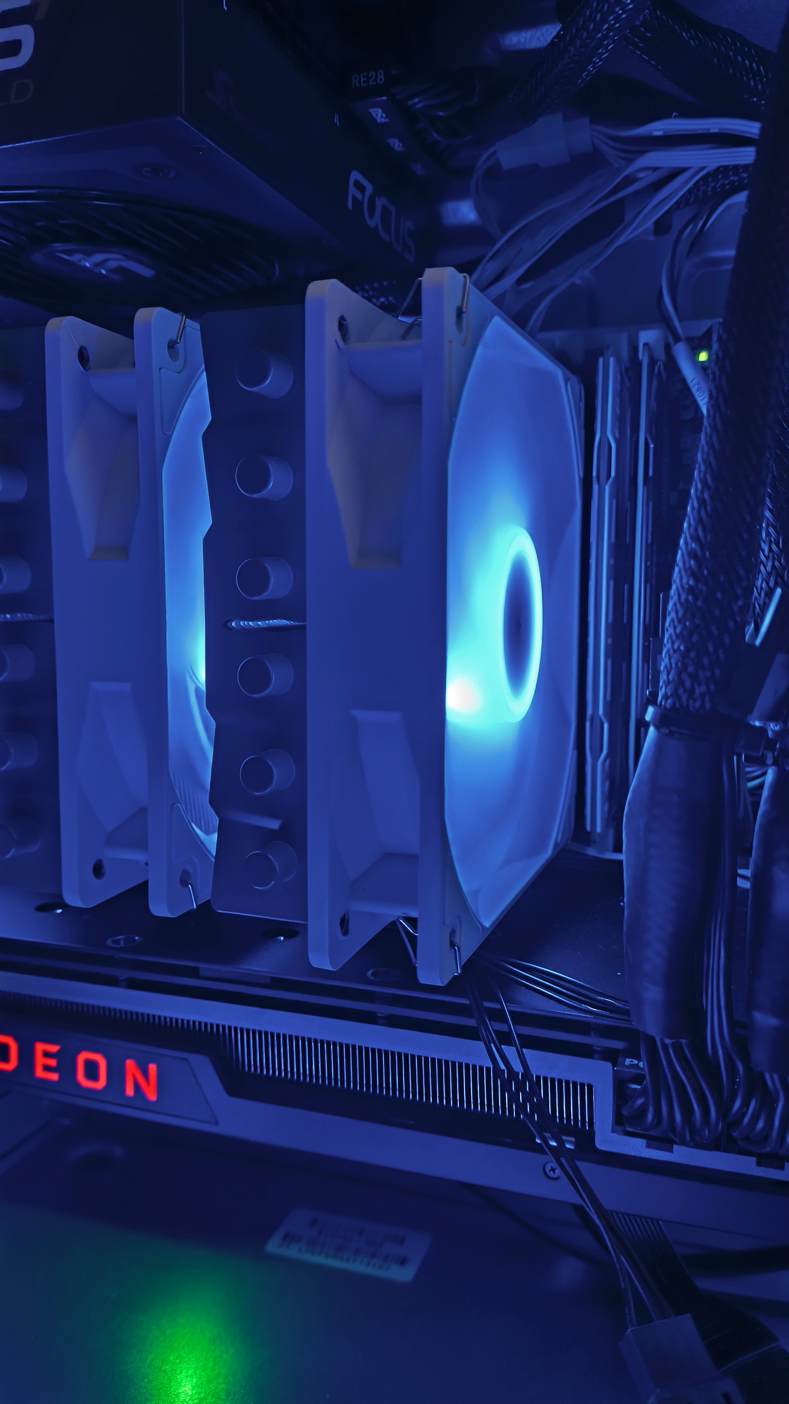 Der vordere 120 mm Lüfter musstes wegen des RAMs leicht versetzt werden, weshalb so ziemlich genau 2 mm Luft bis zum Gehäusedeckel bleiben. Für den Notfall hatte ich schon einen 90 mm Lüpfter eingeplant und bereitliegen: