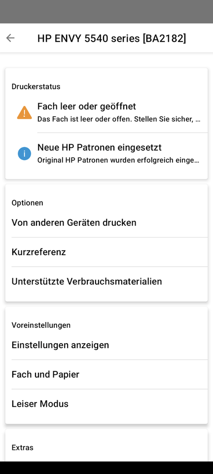 Der Drucker stand noch mit "Achtung" in den Einstellungen, also startete ich den PC neu.